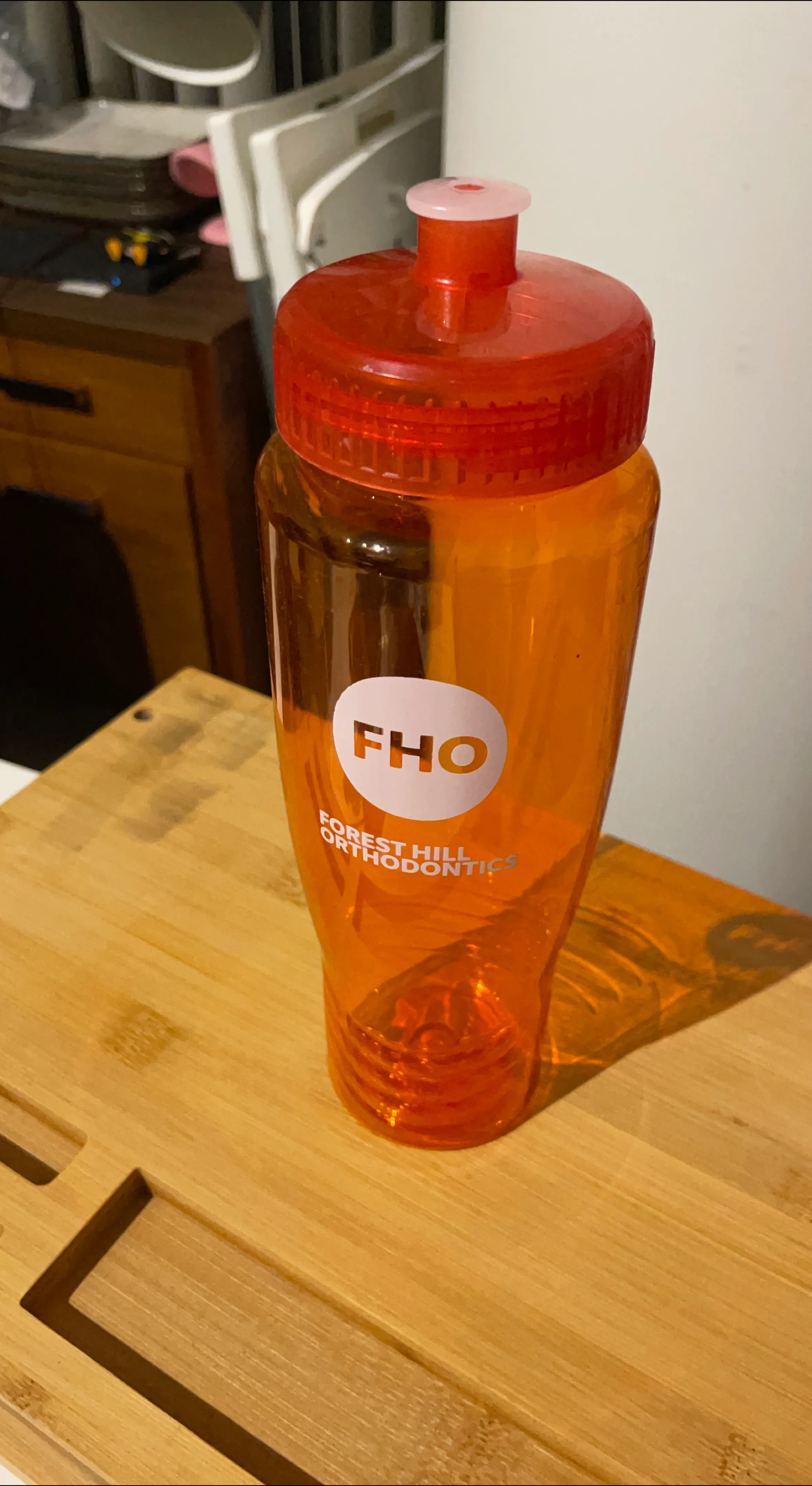An orange water bottle, never used. Comes with an orange lid. Perfect for staying hydrated throughout the day.