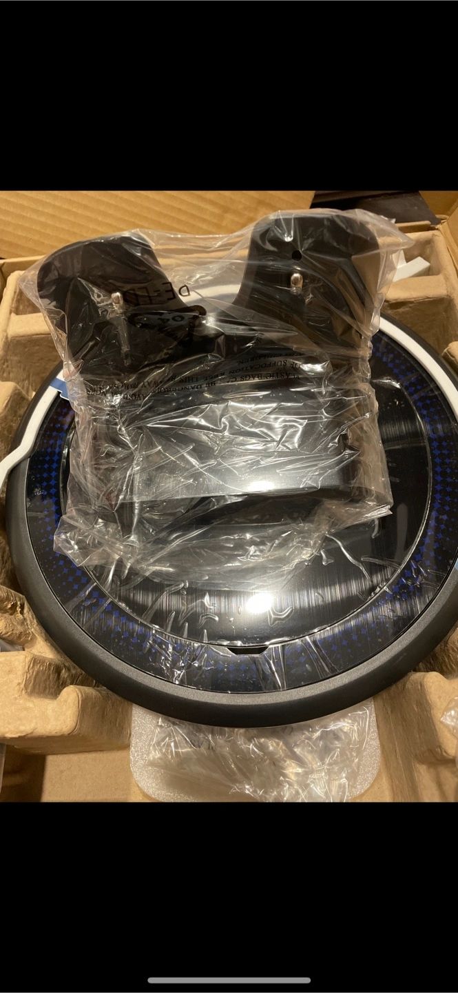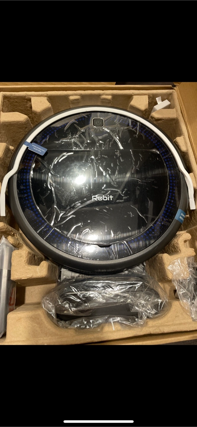 607A brand new robot vacuum, still in its packaging. It's round in shape with blue accents. Comes with a charging base. A useful tool for a relaxing clean up experience.