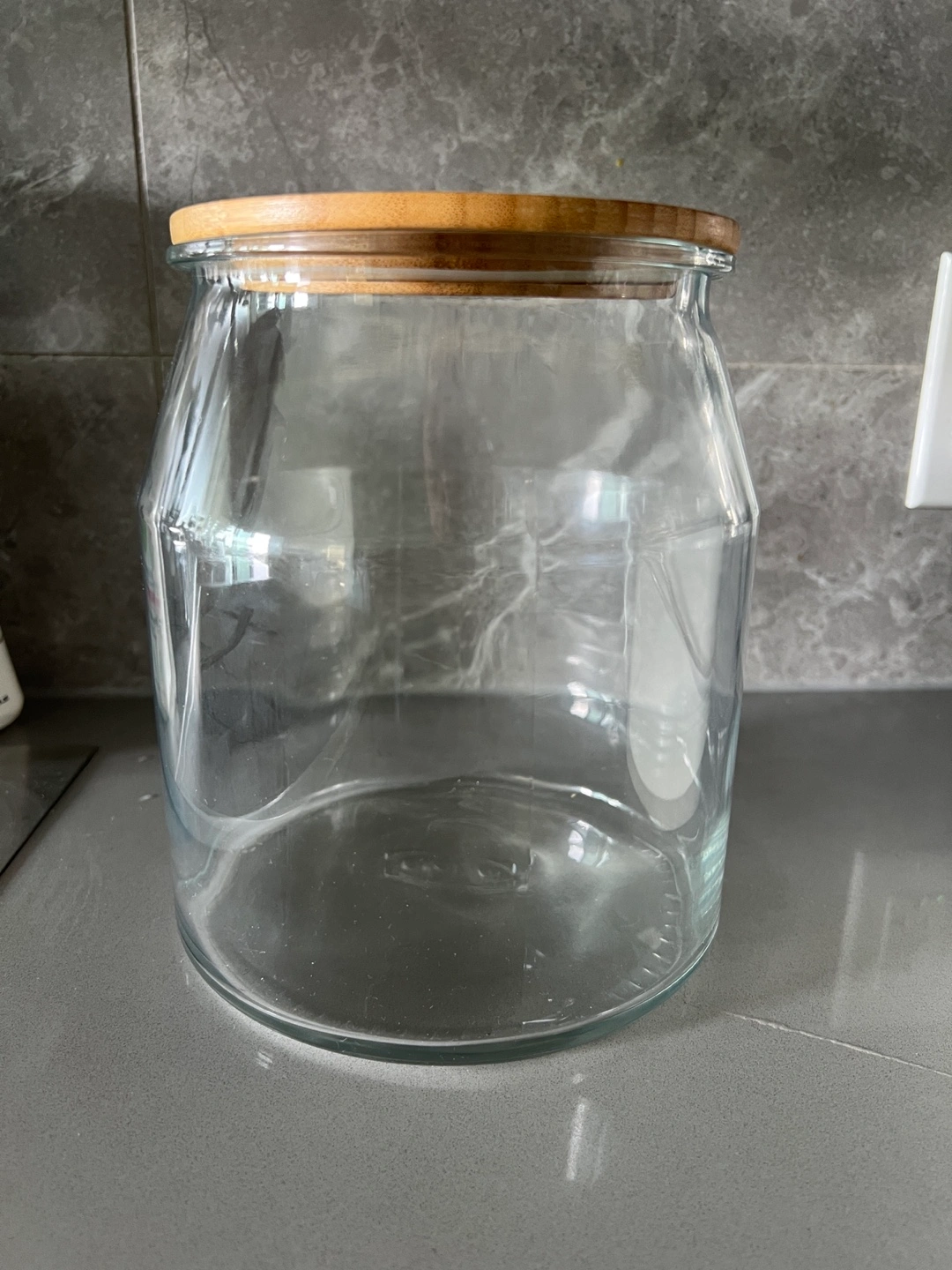 A large glass jar, perfect for storing any goods. The jar has a rounded base and a straight body, topped with a wooden lid. You can use it for homemade granola, ensuring your start to the day is peaceful.