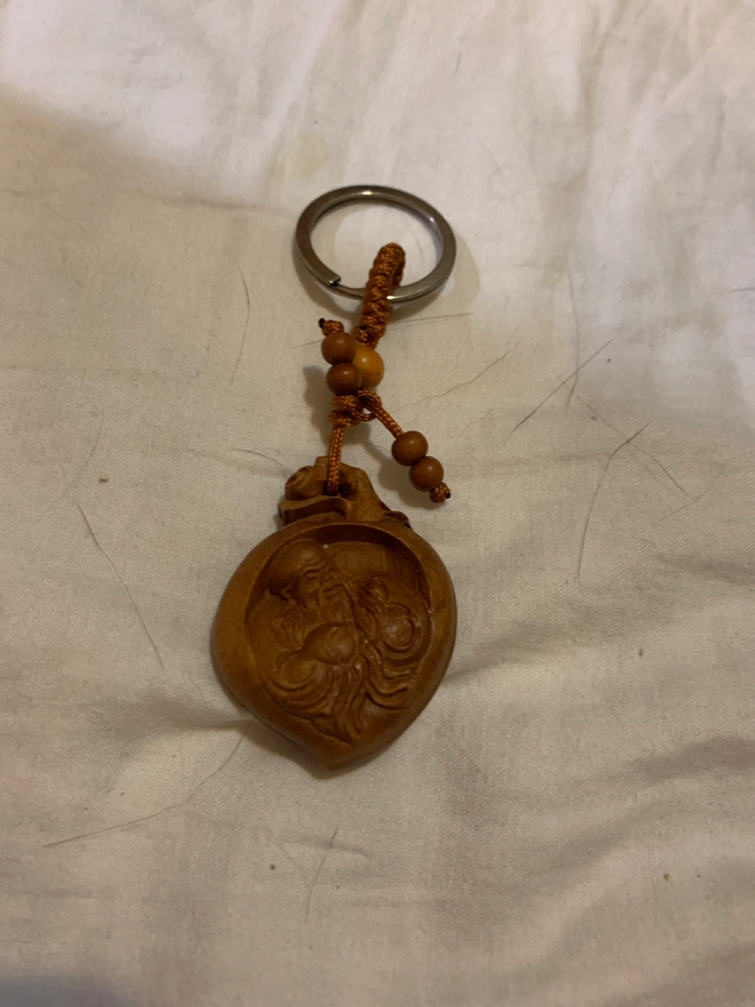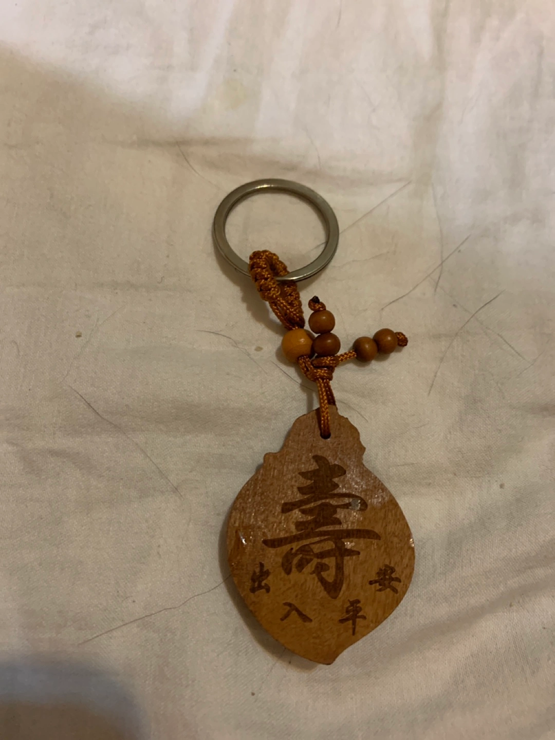 Wooden key chain. Features a decorative charm with engravings. Includes a metal keyring and beaded accents. This key chain would be a wonderful gift to show someone you care.