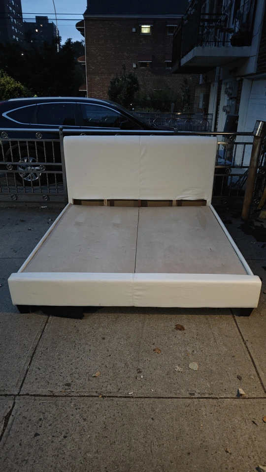 A standard king sized bed frame that fit a king sized mattress. Features plush, front white , vinyl headboard, and plush side frames ( protects your knees, toes when bumped into it hard) . It would be a wonderful addition to any luxury bedroom setting. I took it apart and stored in my garage. I Will take zelle first, then I deliver to your front porch or building entrance. Will not take it inside your home or assemble, if withing LIC, Astoria Sunnyside, woodside area . For others, please come to pick up after zelle payment