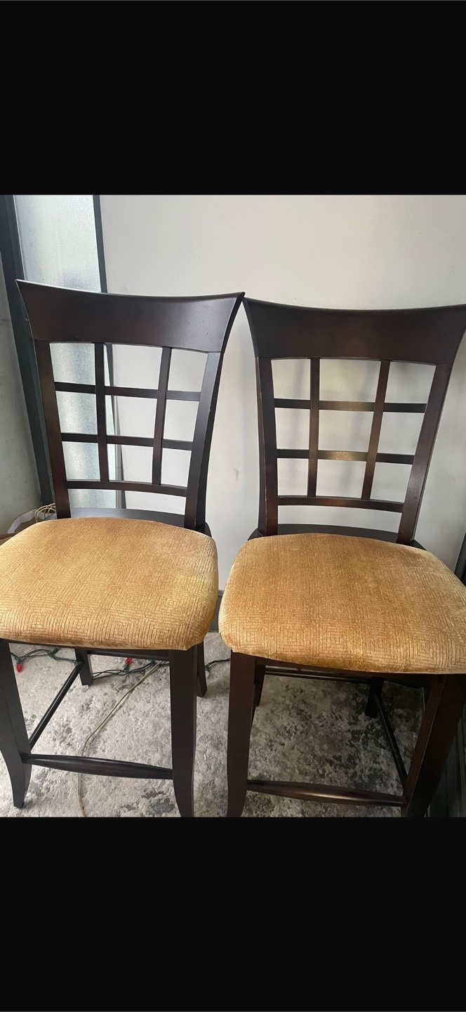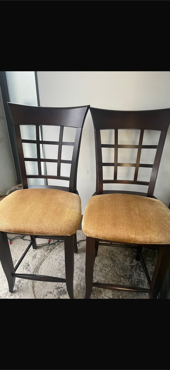 Beautiful dark wood chairs. Feature cushioned seats, with a back design. Perfect for adding a touch of elegance to any dining space, creating a cozy atmosphere for shared meals. Must go ASAP!
