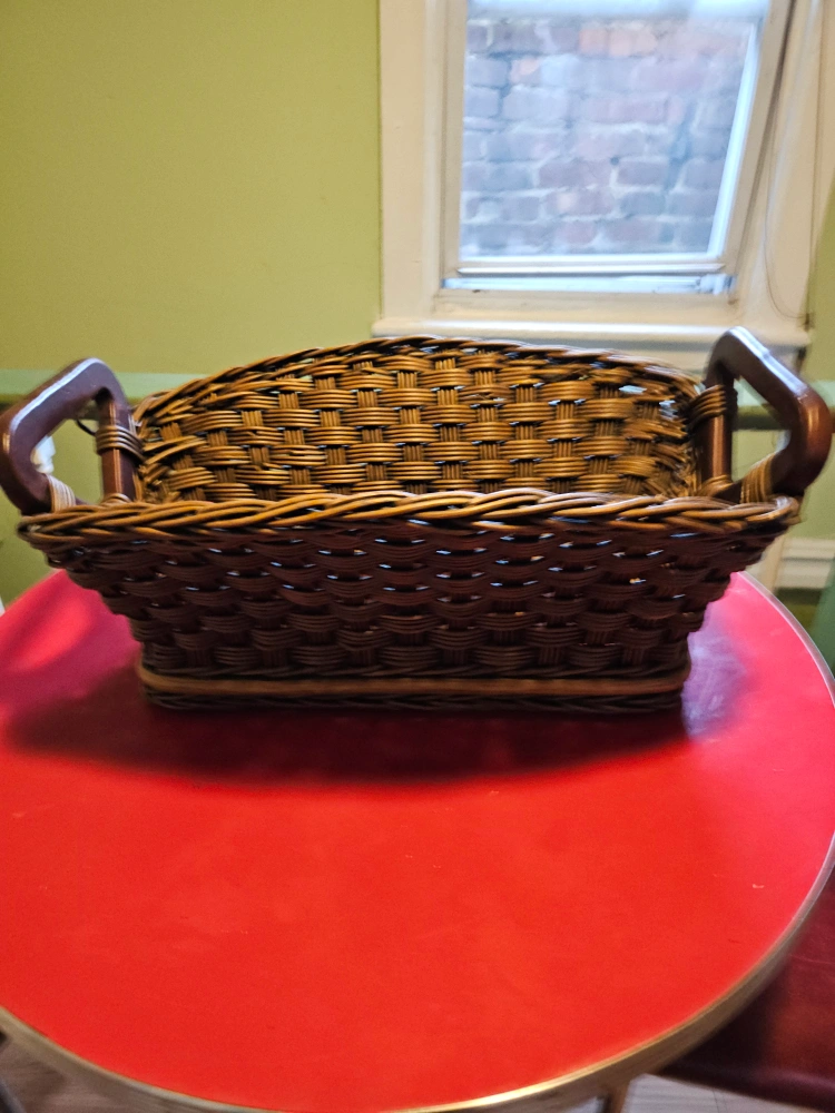 A sturdy wicker basket. Features wooden handles. A dark brown and red color scheme. A great item to gather your thoughts with your favorite items.