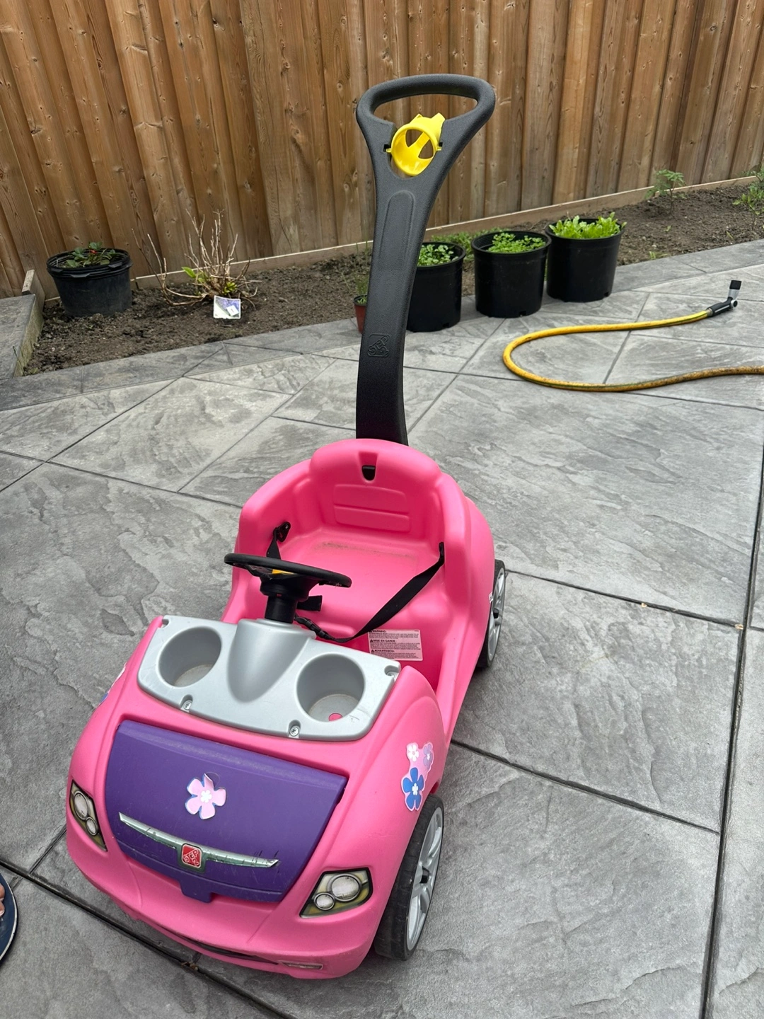 A pink push car with a handle, perfect for little ones. The car features a steering wheel, seatbelt, and cup holders. It has a purple front with flower stickers. This car can provide hours of relaxing outdoor fun.