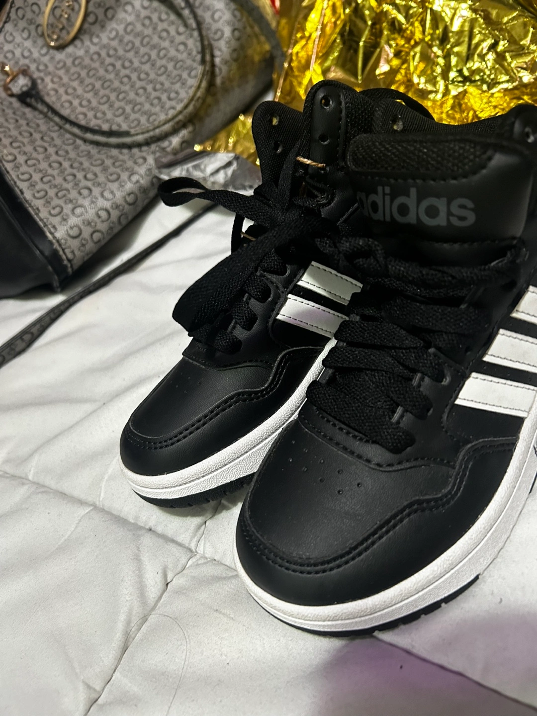 The sneakers feature black uppers with white accents. Classic three-stripe detail on the sides. White soles, and black laces. These sneakers would be perfect for a leisurely stroll.