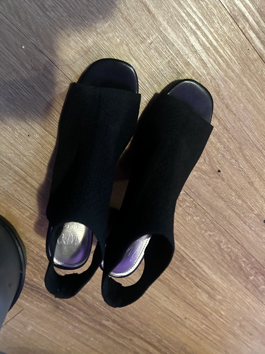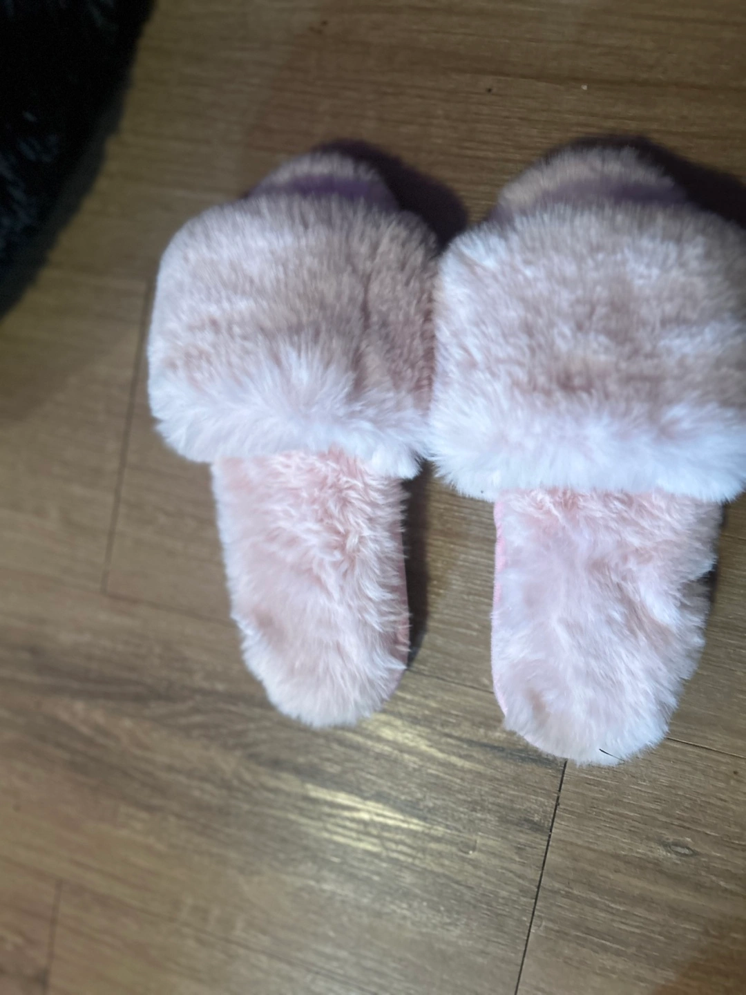 60A lovely collection of shoes. One pair of sandals with denim details. A pair of white and purple sneakers. One pair of blush coloured sandals. A pair of black heeled sandals and lastly a pair of pink fluffy slippers. These shoes are perfect for any occasion, you might find these very relaxing to wear.