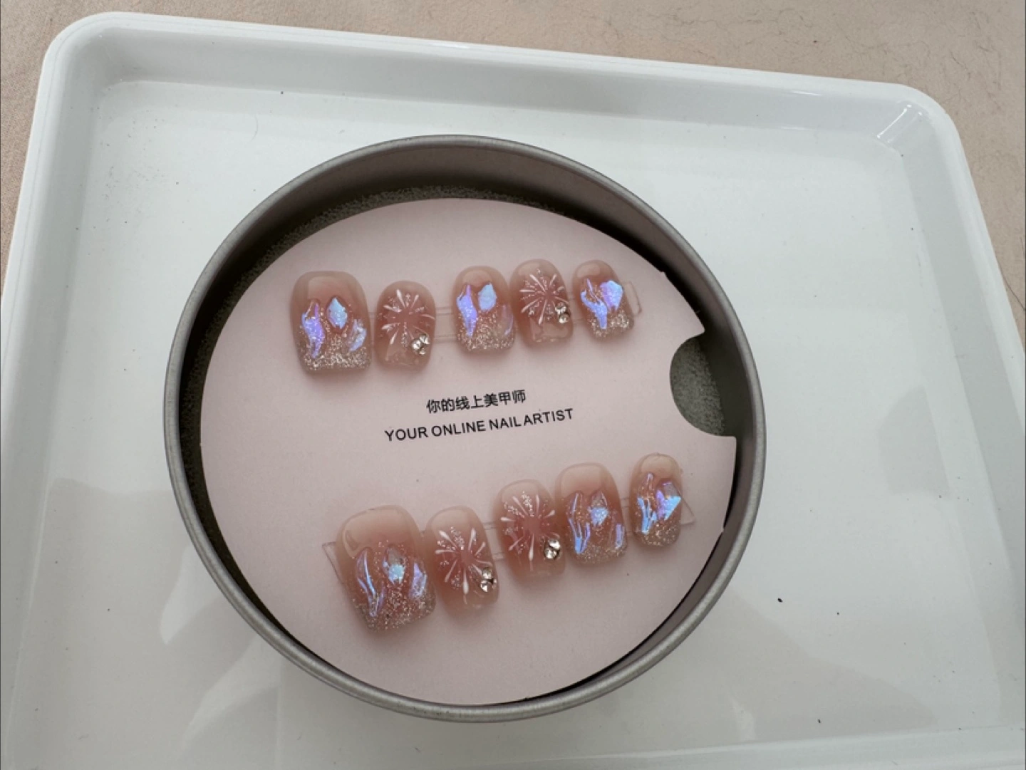 343Set of press-on nails. Features various nail shapes with delicate designs. Includes glitter, iridescent accents, and small embellishments. A perfect item for a self-care night.