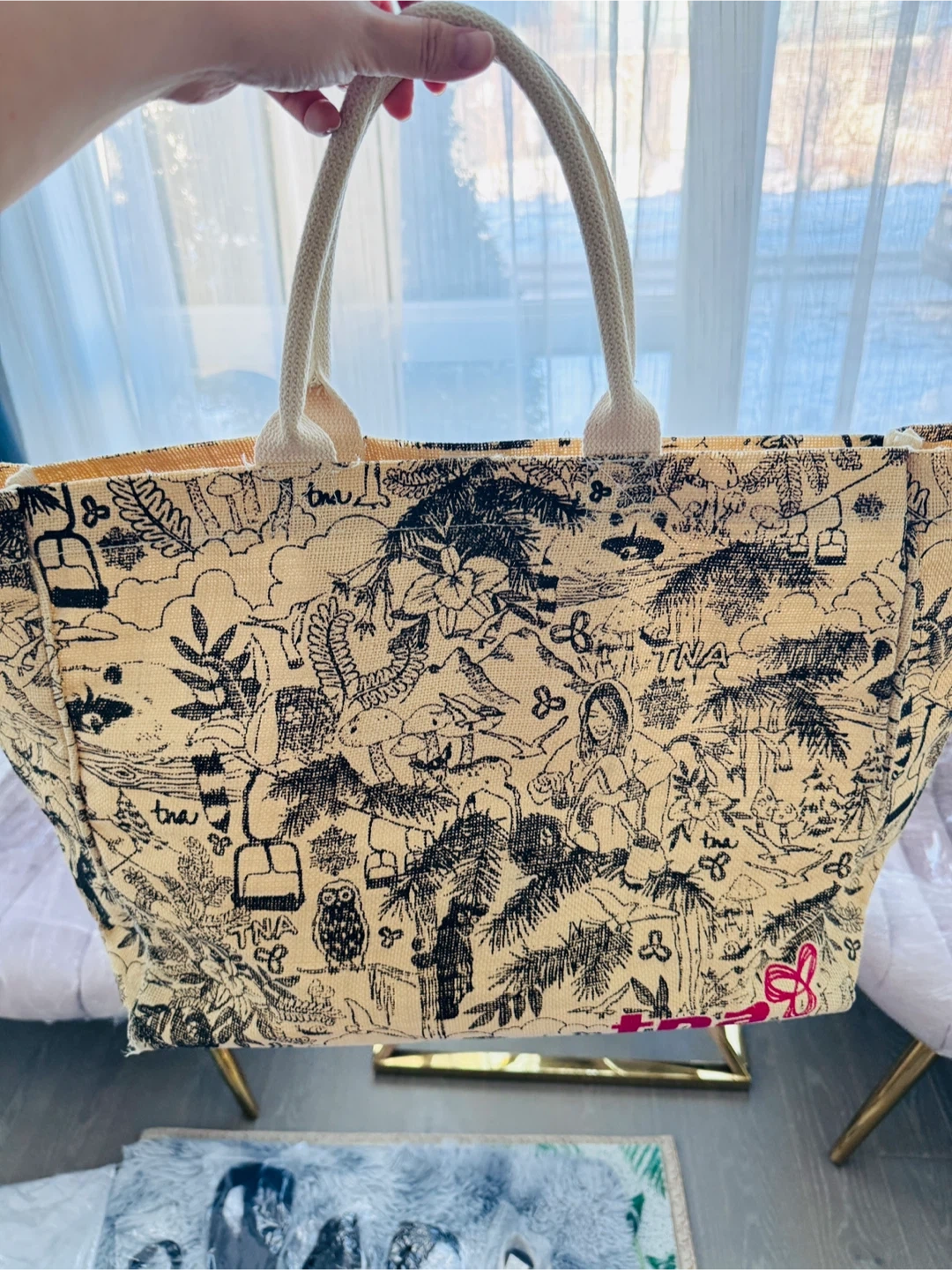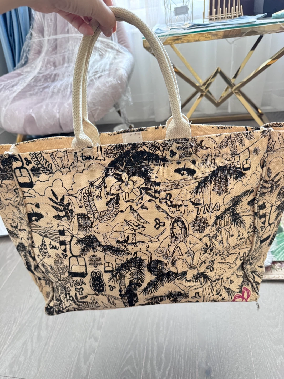 Selling a big TNA tote bag! It's in great condition and perfect for carrying all your essentials. It has a unique design.
