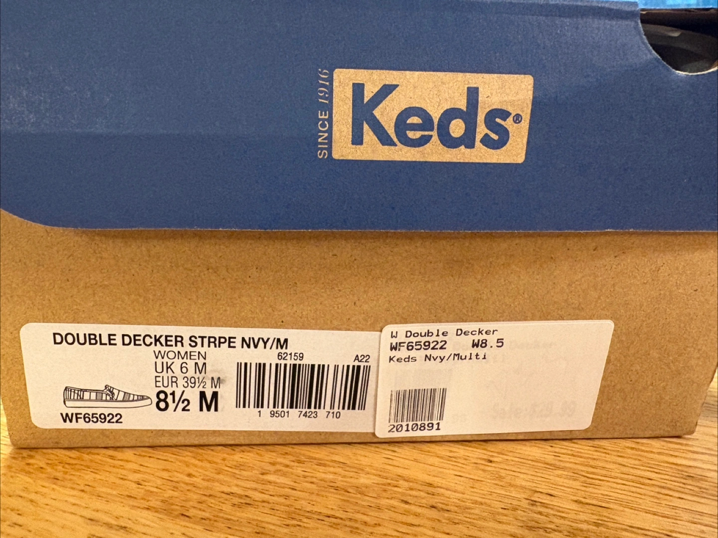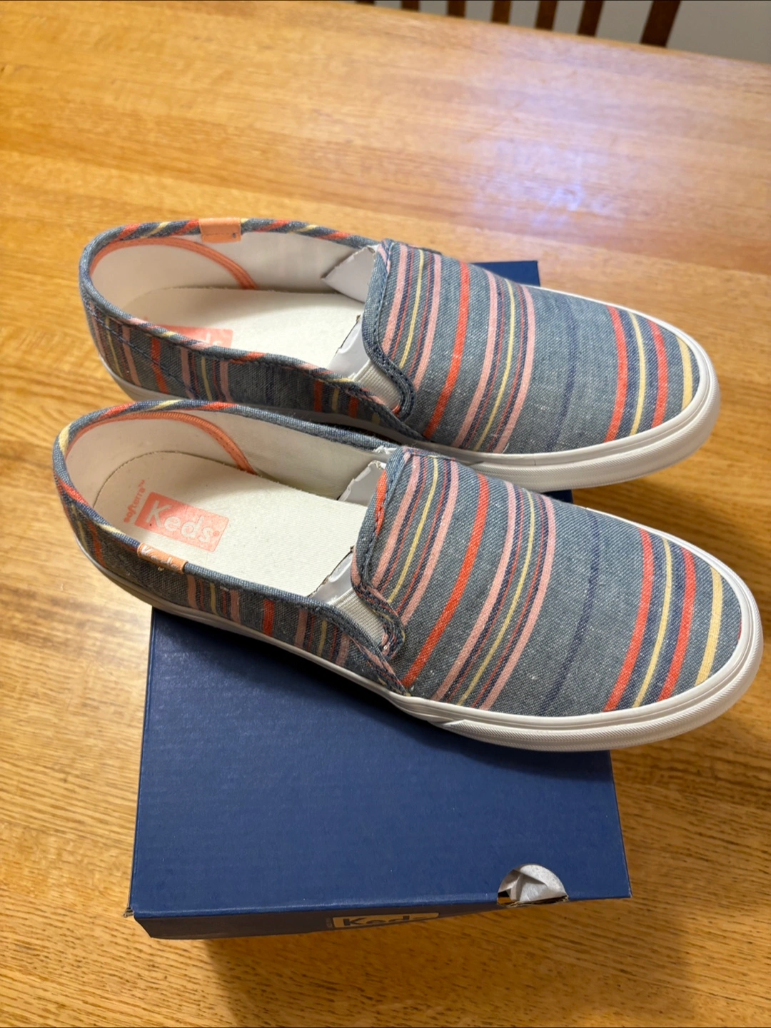 Selling a brand new pair of Keds Double Decker Stripe slip-on shoes for women. Still in the original box, never worn.