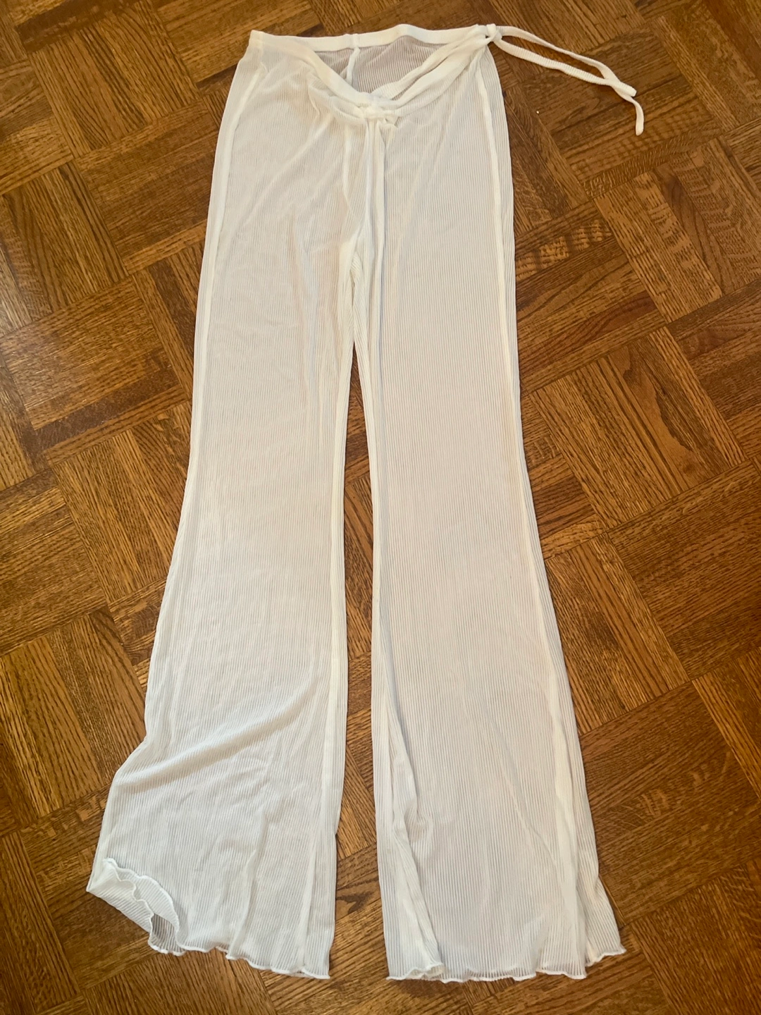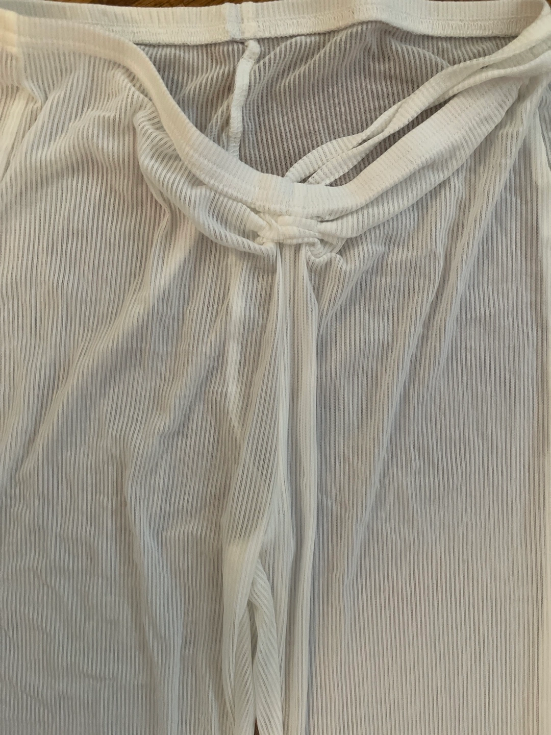 Wide legged pants. Features a drawstring waist. Has vertical ribbing. Perfect for lounging after a long day.