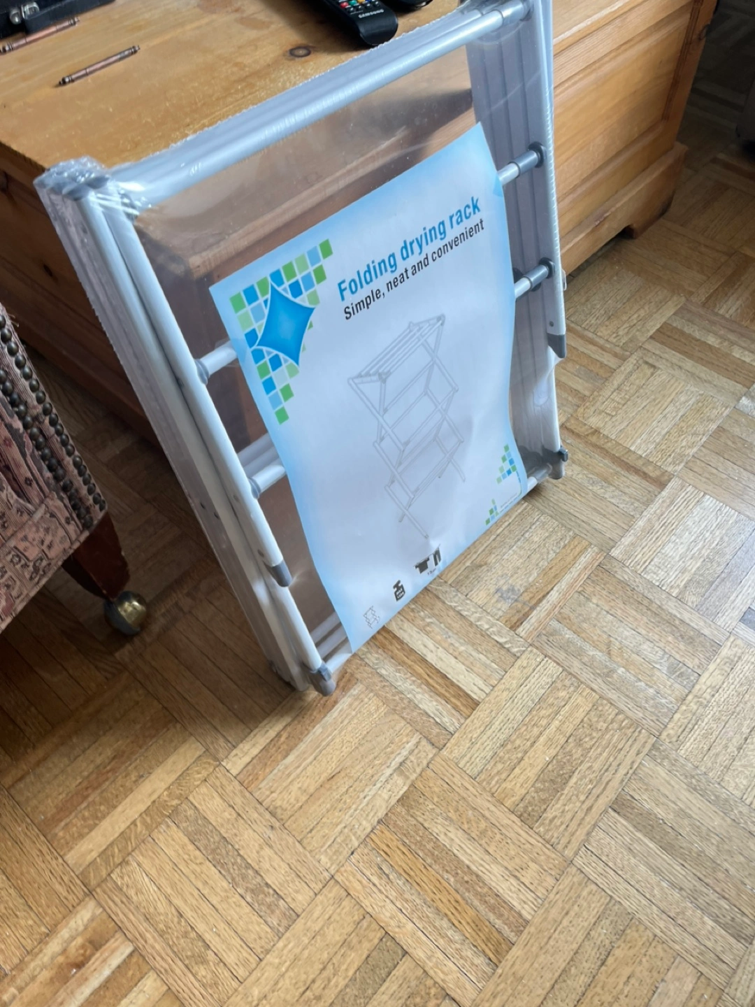 A folding drying rack still in its original packaging. It is simple, neat, and convenient. It is great for drying clothes, especially when space is limited.