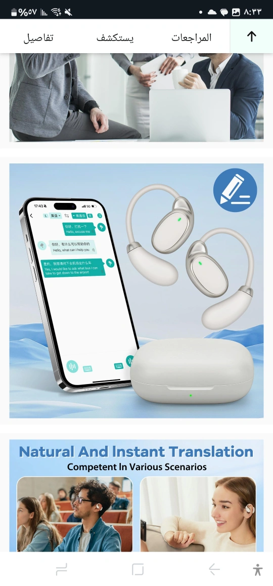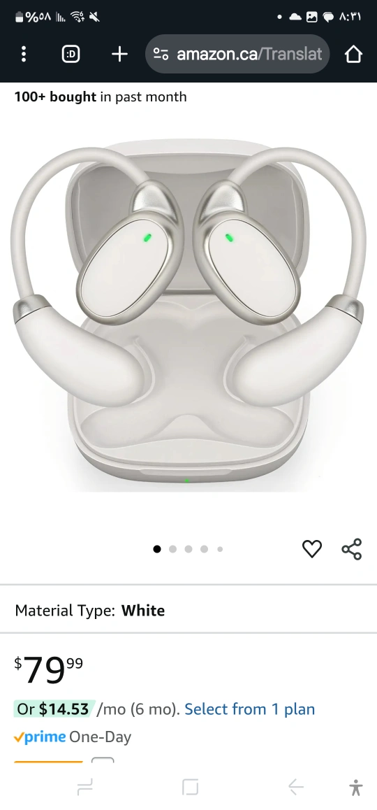 White earbuds with translation features. Charging case included. You can use these to immerse yourself in the sounds of nature.