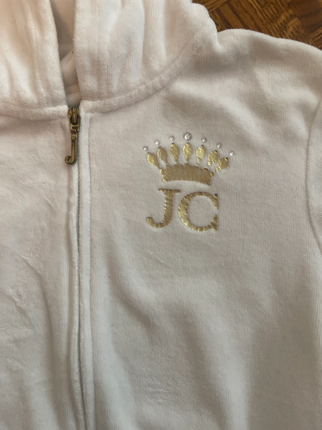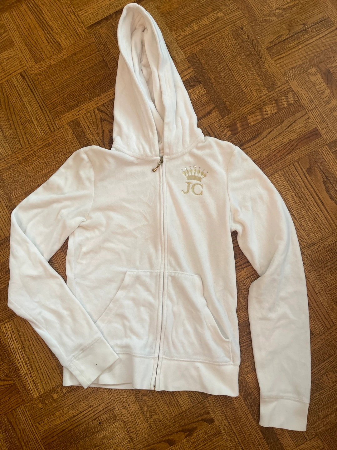 Soft white hooded sweatshirt. Front zipper. Features a front pocket. Includes a hood. It can be used for the ultimate cozy day in.