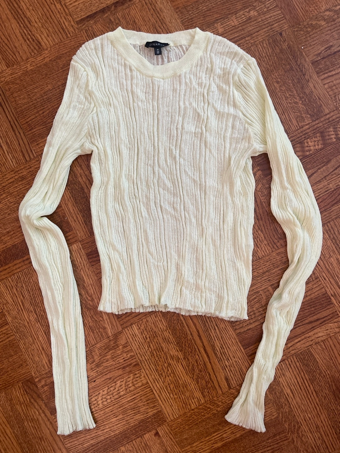 Light-coloured sweater. Ribbed texture. Crew neckline, and long sleeves. A lovely addition to your wardrobe, perfect for layering.