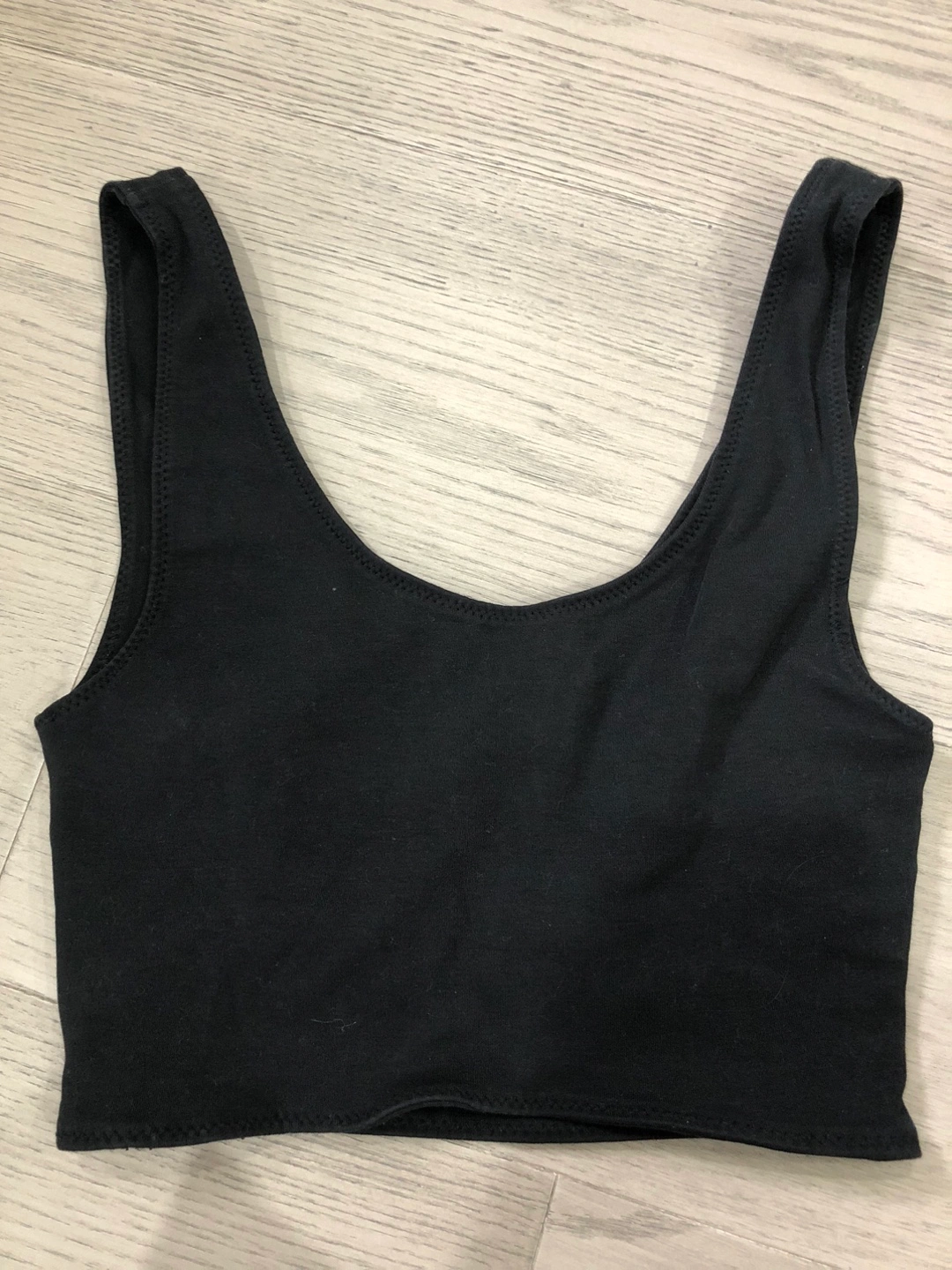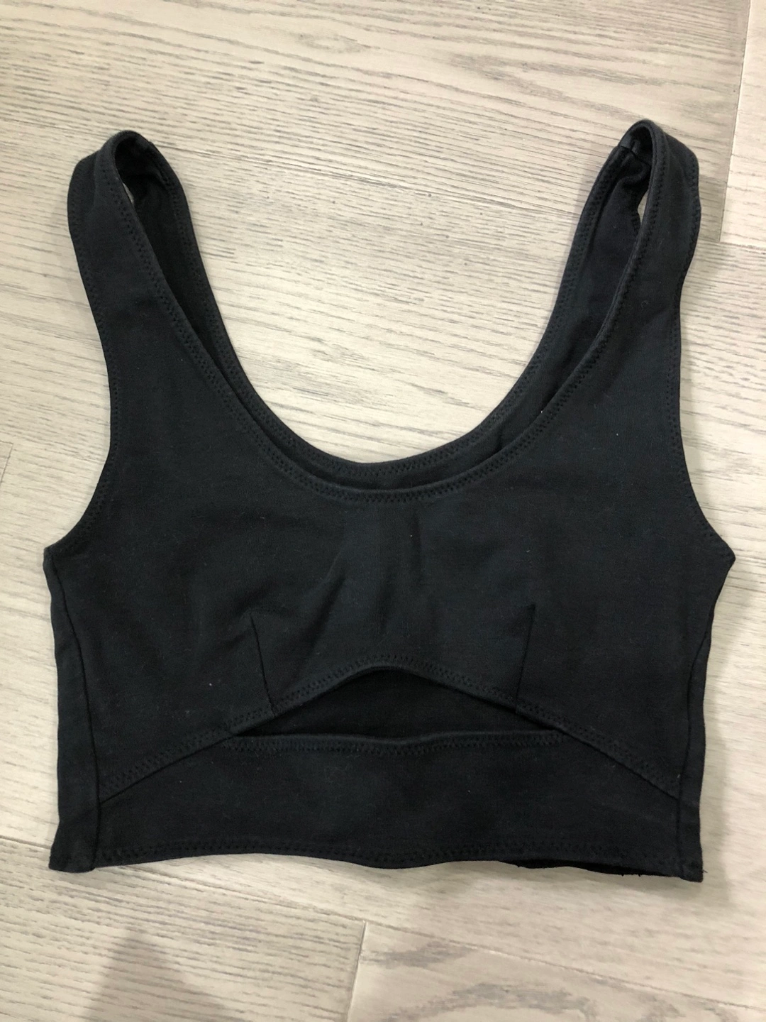 A black crop top with a cutout. The top with straps and a scoop neck. Perfect to wear on a relaxing day.
