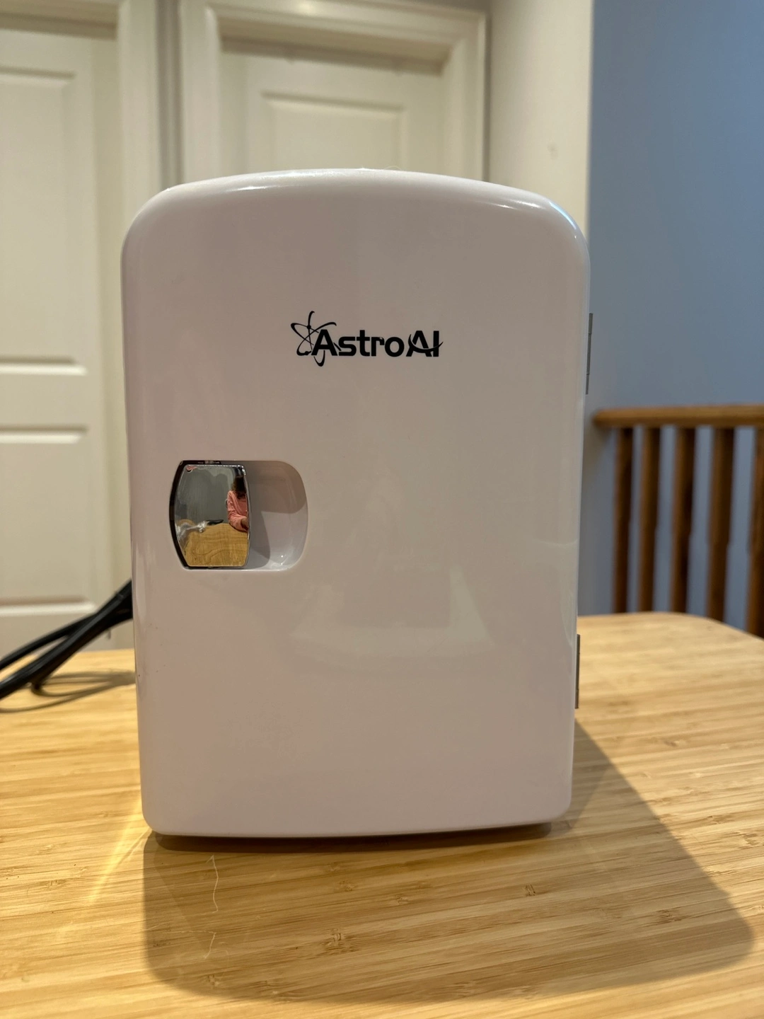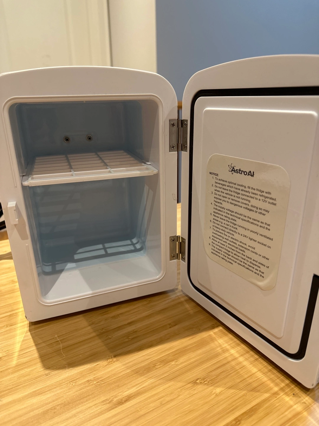 Small white mini fridge. Features a handle for easy carrying. Equipped with shelves, a small door latch, and a control panel. You could put this fridge in your bedroom for a refreshing drink.