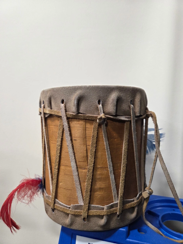Unique drum with tan suede tops, and leather lacing. The body appears to be made from a light-colored wood or birch bark. Decorated with colourful feathers. Perfect for someone who enjoys the rhythm of music.