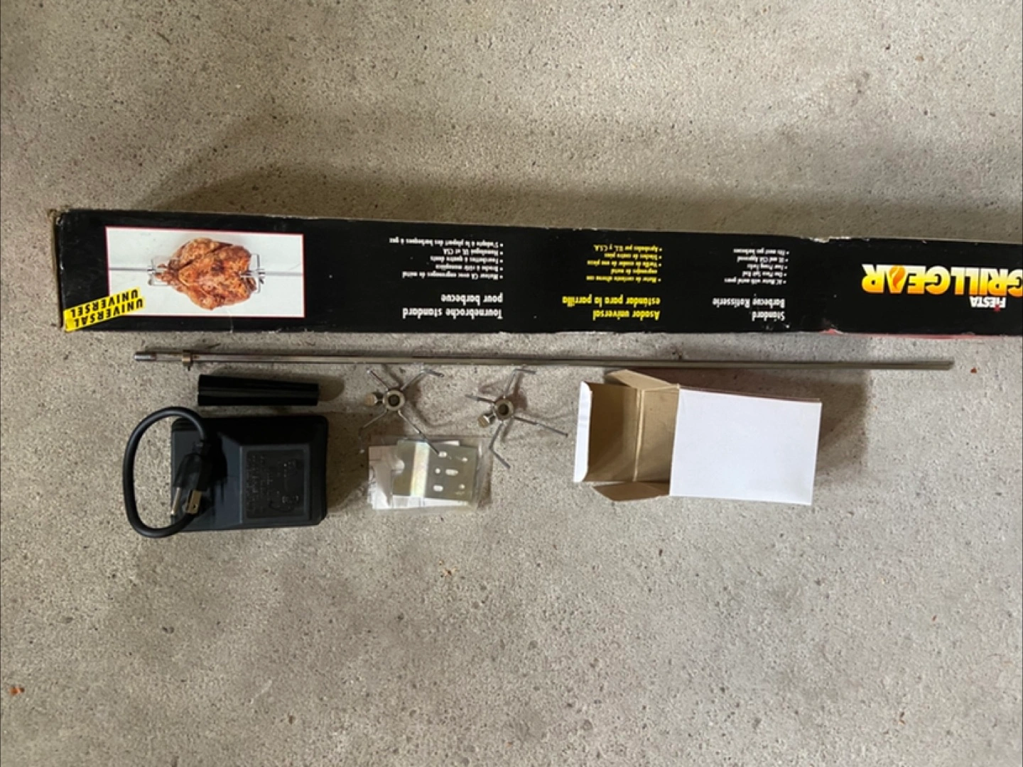 New Barbecue rotisserie with all its parts. Box included, with some instructions visible. Imagine all the great meals you will enjoy while using this set. Cash and carry only.