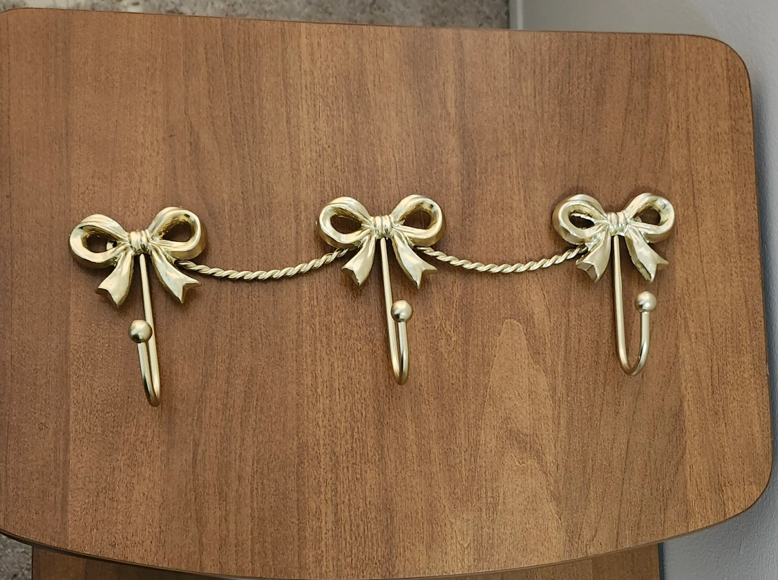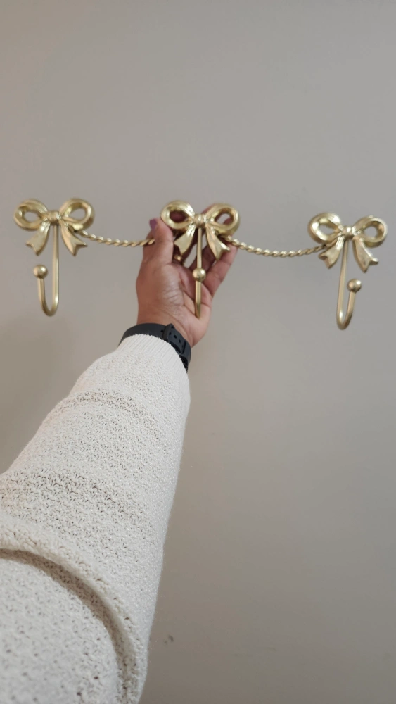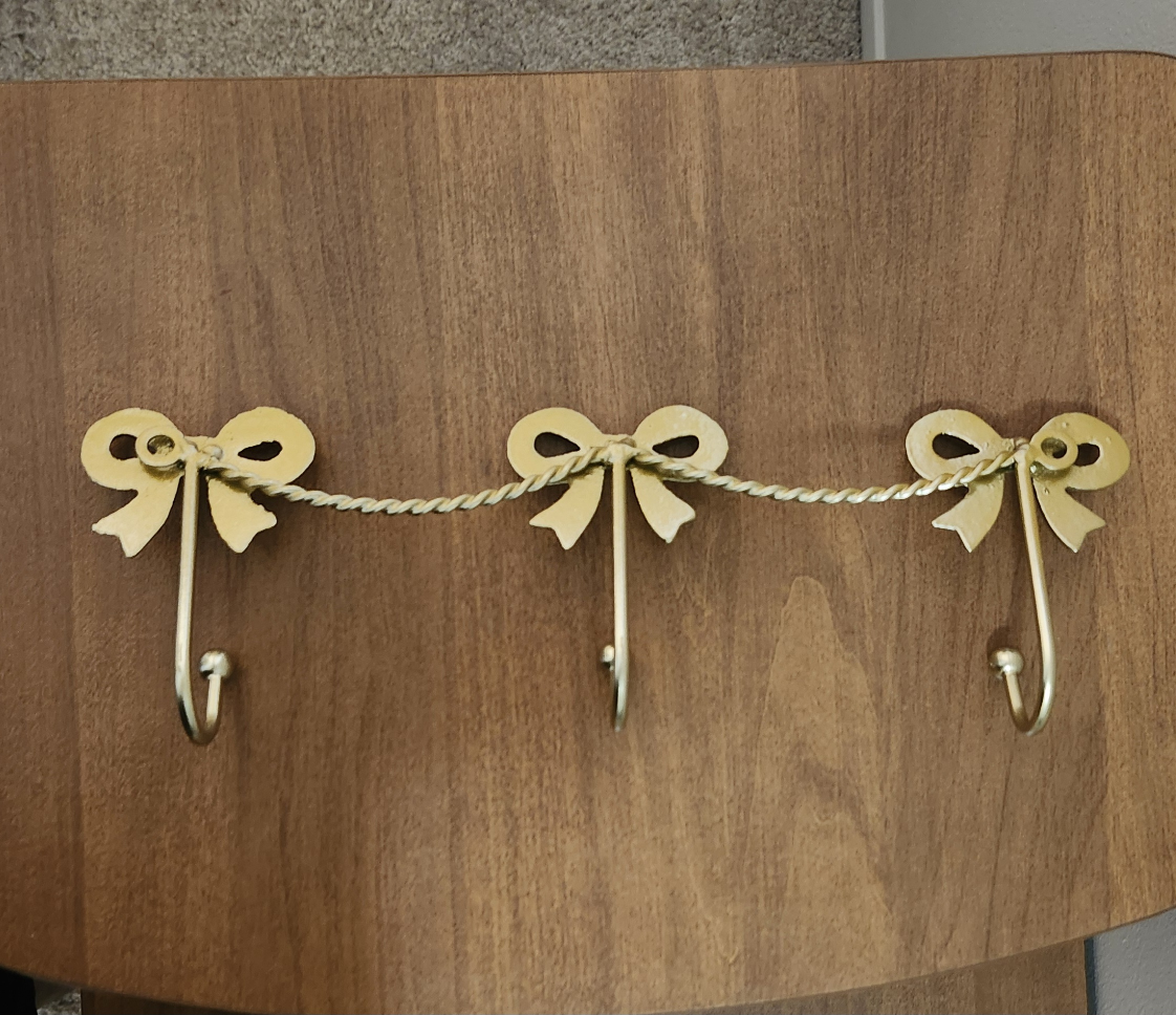Cat Iron bow shaped coat hanger. Features three hooks for hanging items. Consider hanging this in your entryway for easy organization.