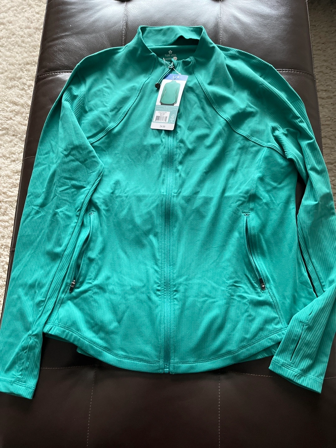 A long-sleeved jacket in a teal colour. It has a full zipper and two front pockets. A tag still attached. Consider this piece for a relaxing walk.