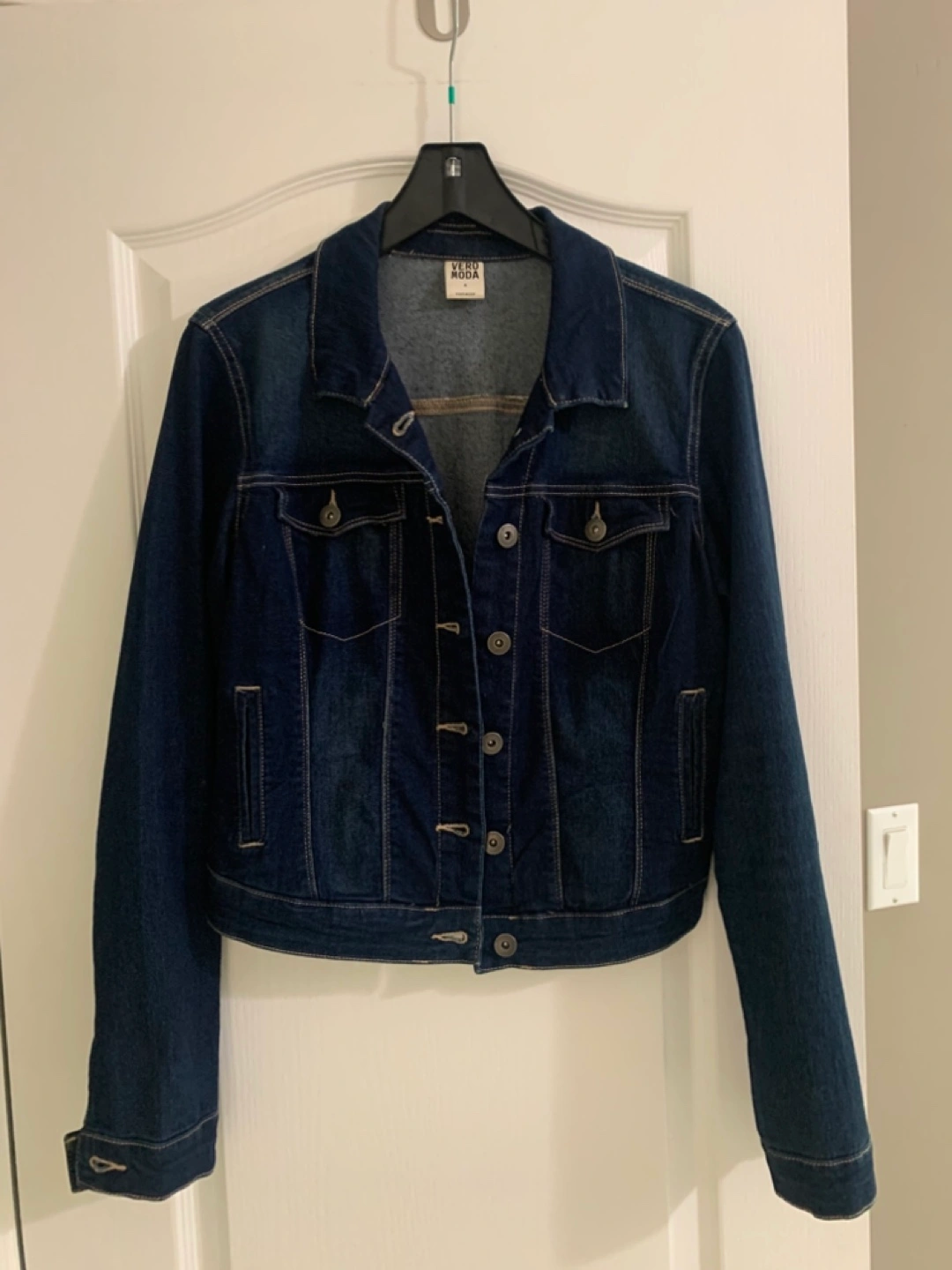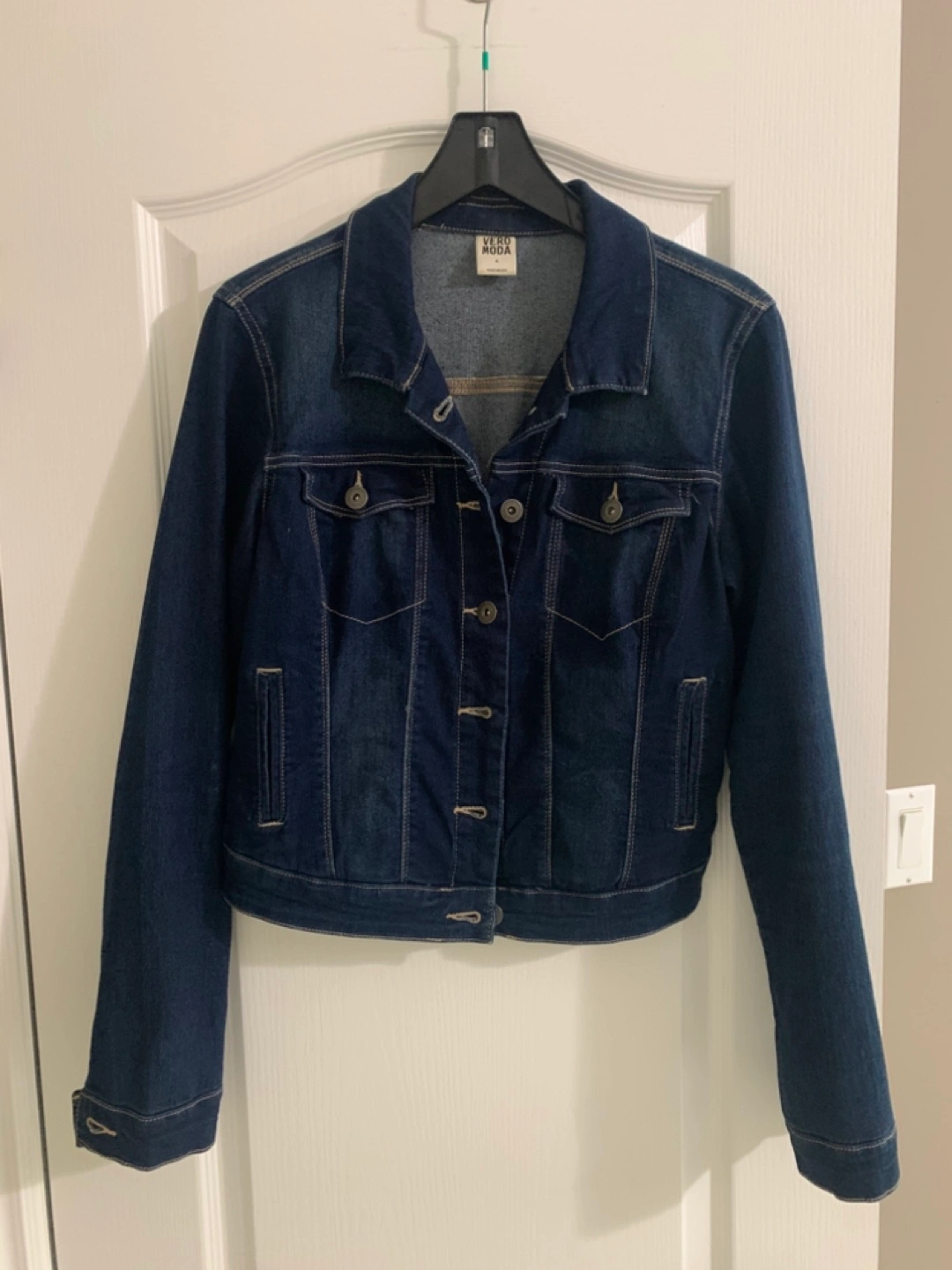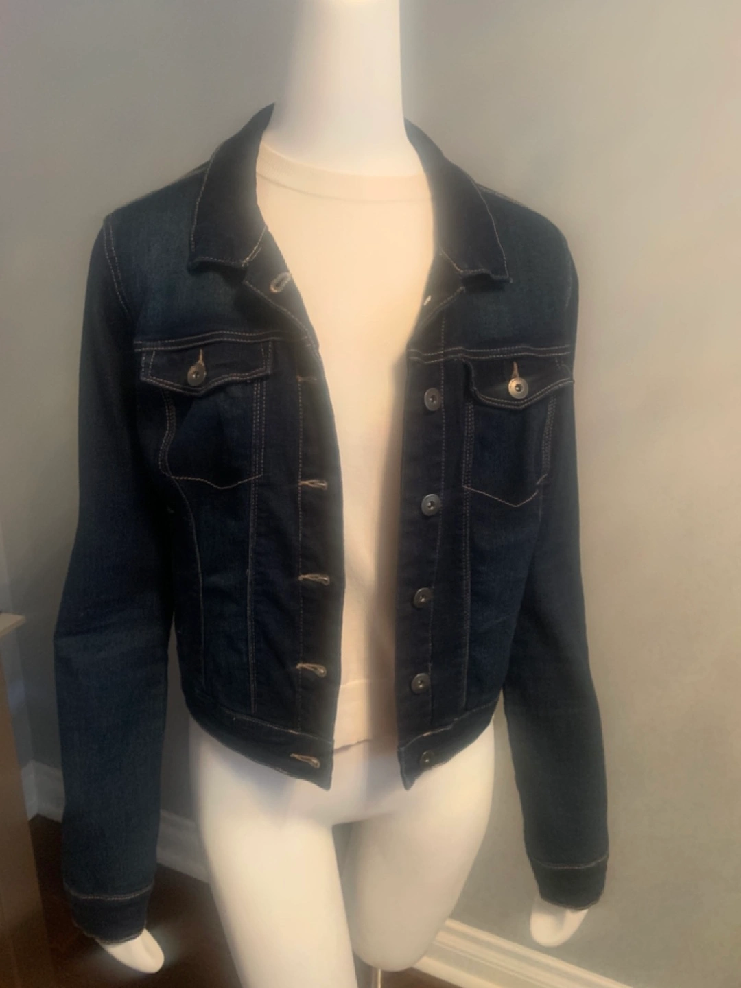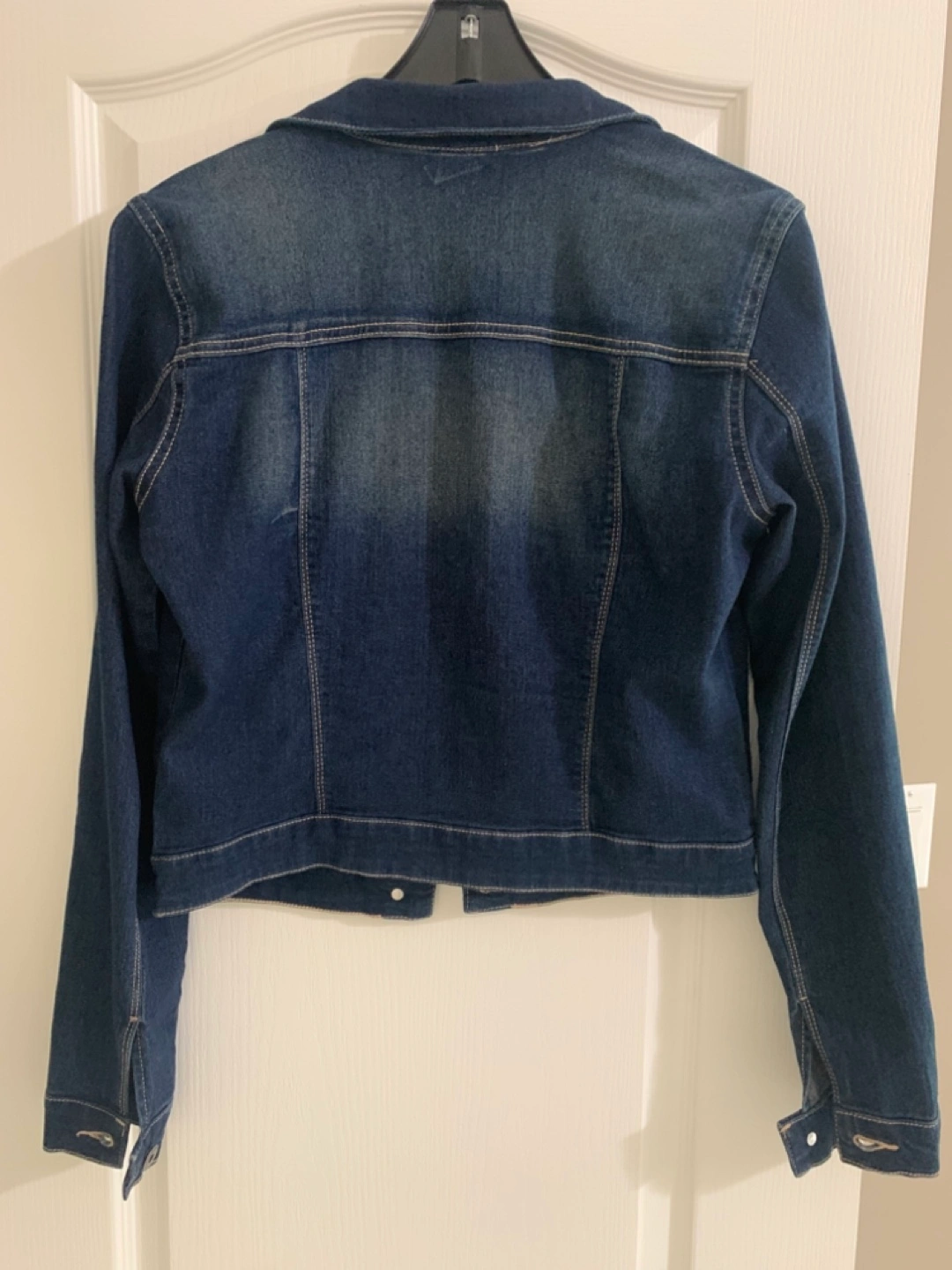 A denim jacket with some stretch Measurements are flat lay: Chest (Pit to pit): 19 inches Sleeve length (shoulder seam to cuff): 25 inches Jacket length (collar to hem): 18.5 inches Shoulder to shoulder (sleeve seam to sleeve seam): 16 inches