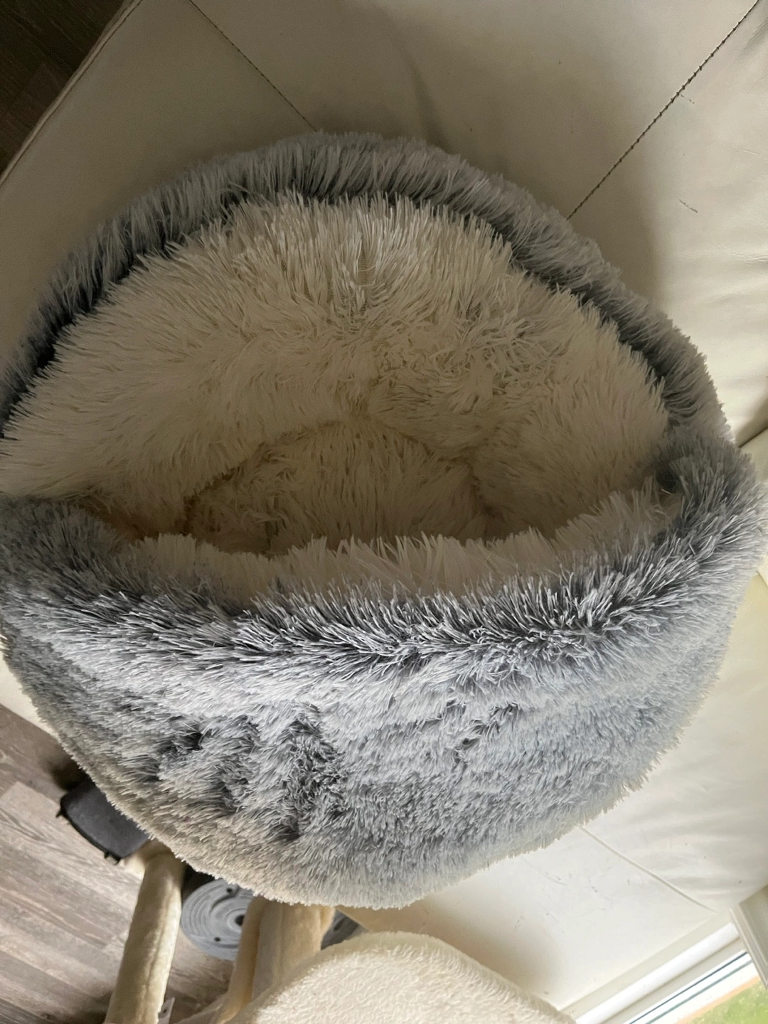 Gray and white colours, with a soft, shaggy texture. Perfect for napping after a long day.