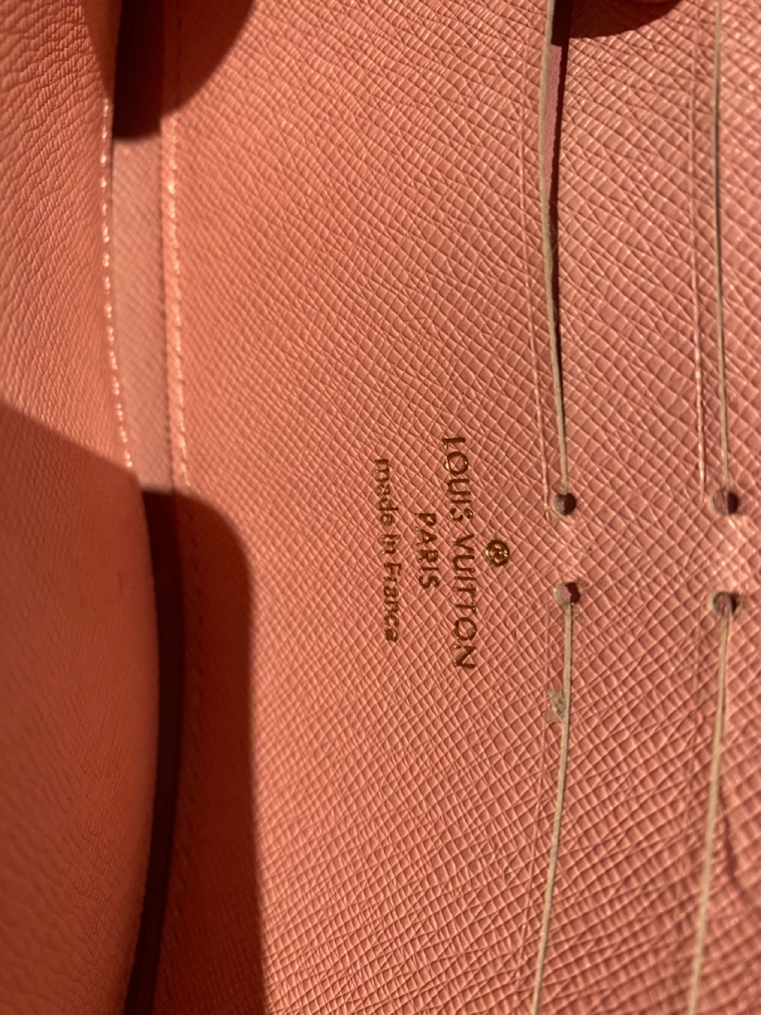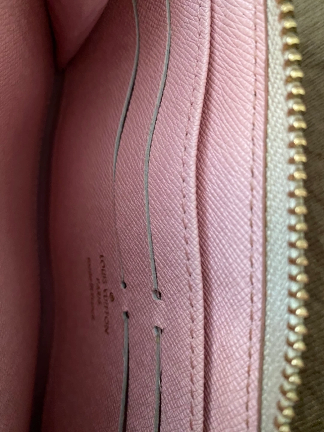 36The exterior features a white and blue checkered pattern with a pink design. It has a gold zipper and a pink interior. I hope you'll love this wallet as much as I do, as it will hold your things beautifully.