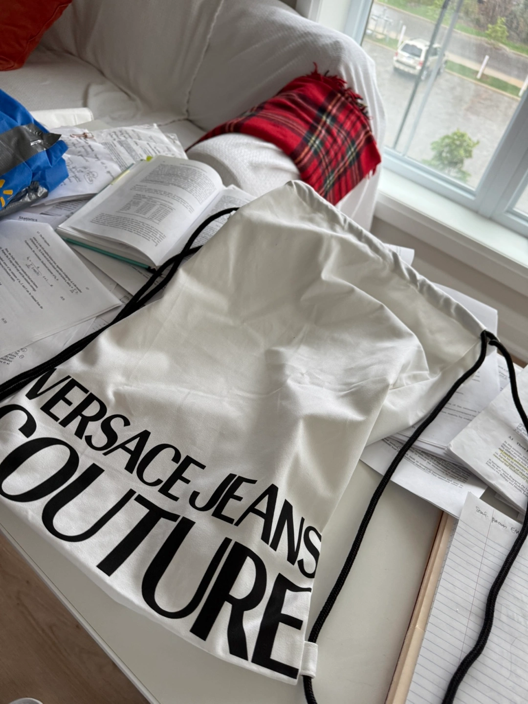 White drawstring bag. Featuring bold black text. Long black drawstring cord. You can easily store your gym gear in this stylish bag.