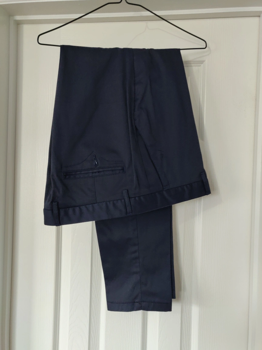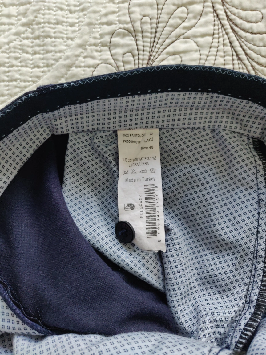Navy blue pants 48x 30 there's room to go to 32 length. the fabric on this is quite exquisite! Made in Turkey! only reason I am selling is because they do not fit anymore due to weight loss.