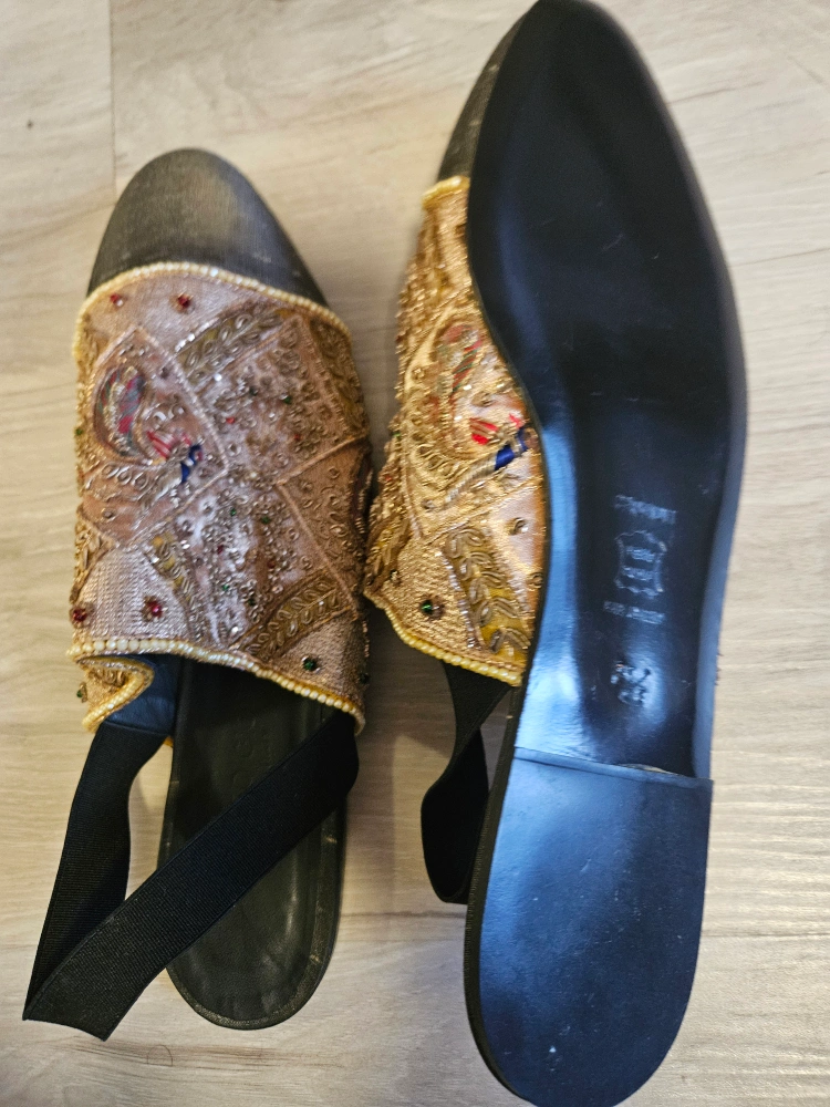 79Pair of sandals. Embellished with an ornate design. Features beads and colorful jewels. The back strap appears to be elastic.