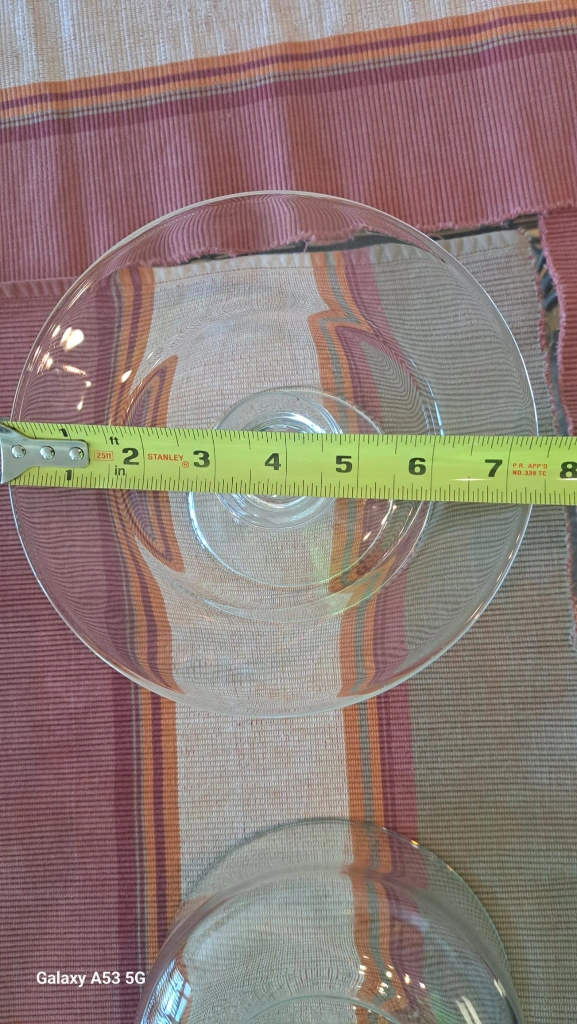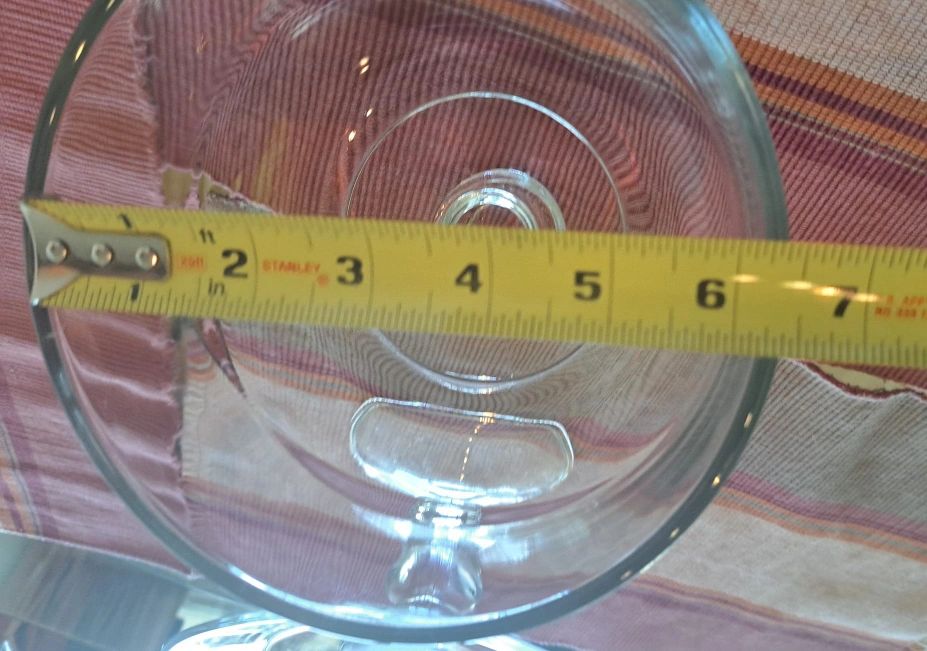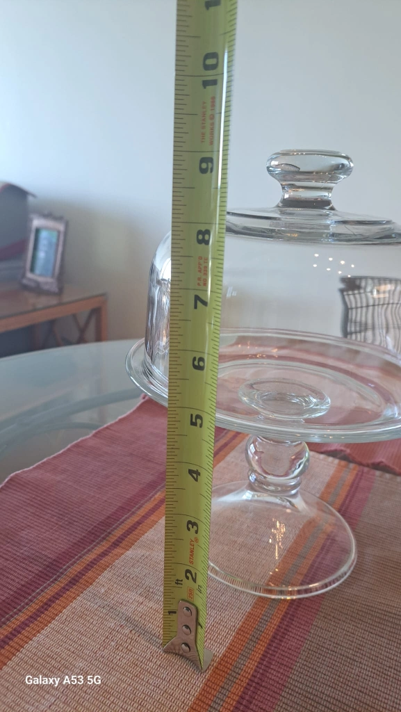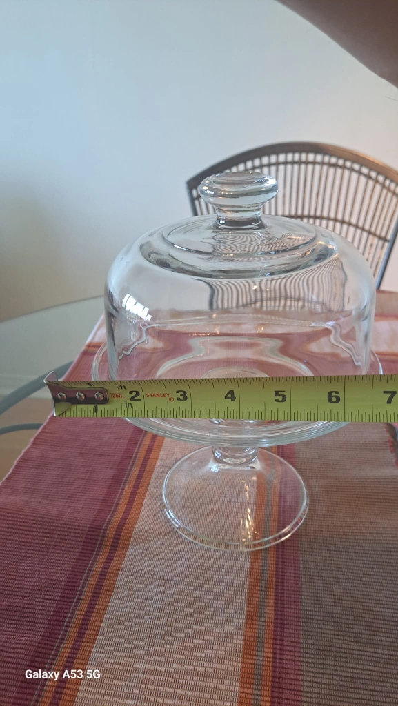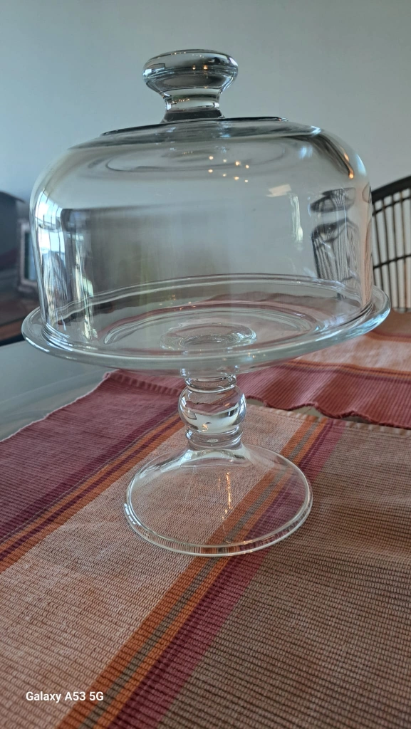 A clear glass cake stand. Comes with a domed lid. The stand has a round base and a pedestal. The top platform has a raised edge to prevent anything from sliding off. Perfect for displaying and protecting your baked goods, this cake stand is sure to bring you a sense of peace.