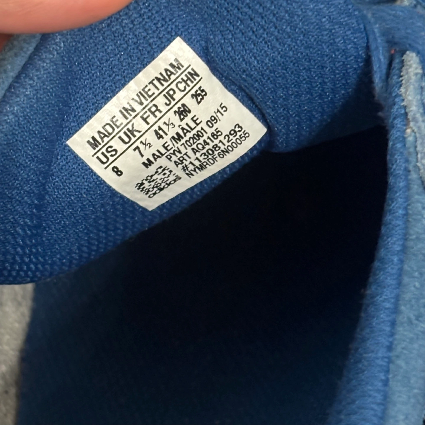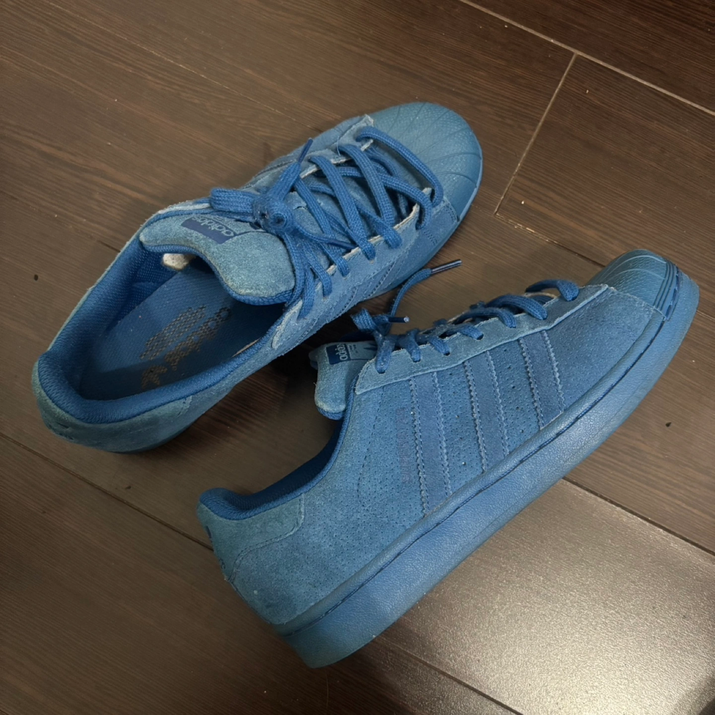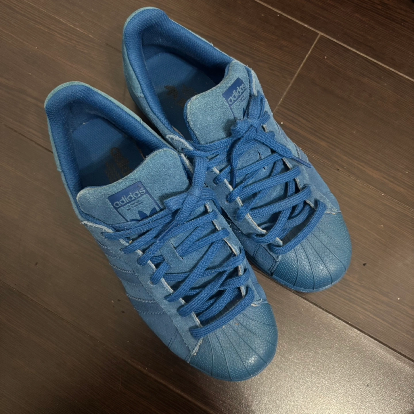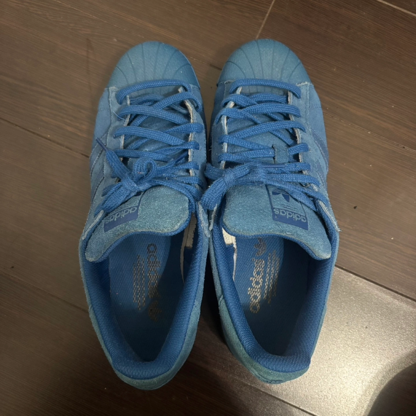 Bright blue sneakers. Feature laces. The classic three stripes are visible on the side. These are perfect for a walk in the park, enjoying the beautiful day ahead.