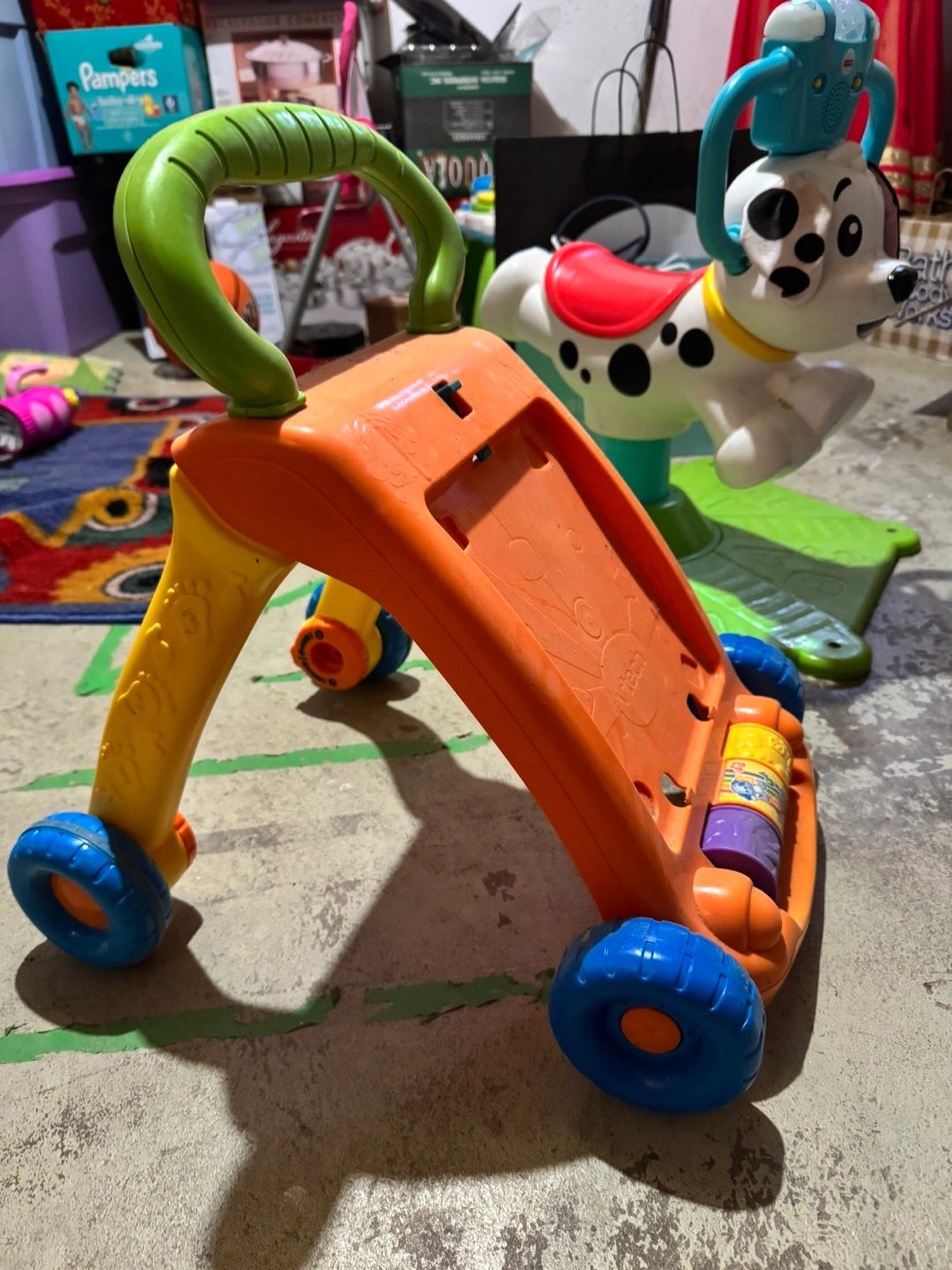 A colorful toy walker, with four wheels. Has a handle on top for your little one to hold onto. Features different colors and textures. Perfect for early walkers to help them find their balance.