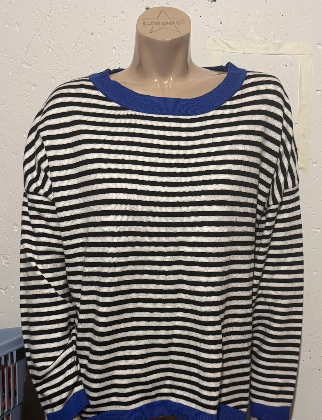 Sweater with black and white stripes. Featuring blue accents on the neckline and bottom hem. A great sweater for lounging around on a chilly day.