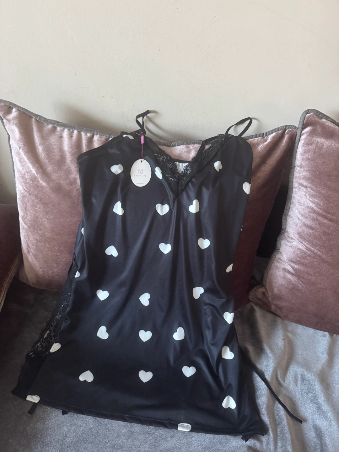 A lovely slip dress featuring white hearts. The dress has lace detailing, and thin straps. You may find this dress to be perfect for a relaxing night in.
