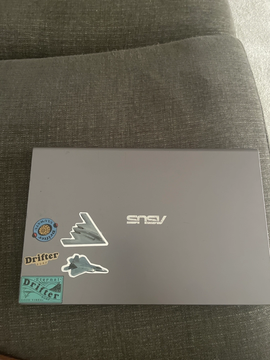 A grey laptop. It appears to have stickers on the top. Keyboard included. You will love watching movies and getting things done with this wonderful device.