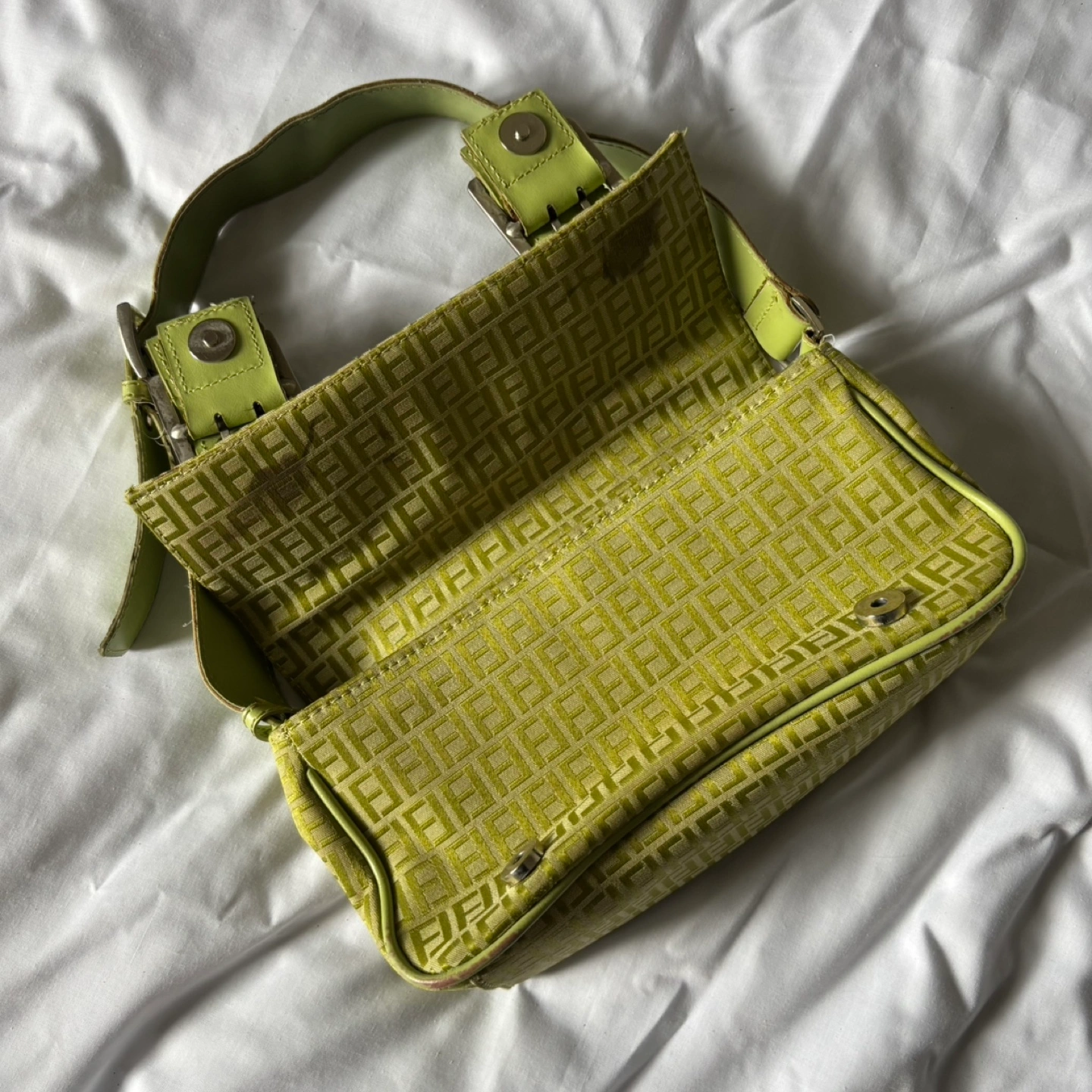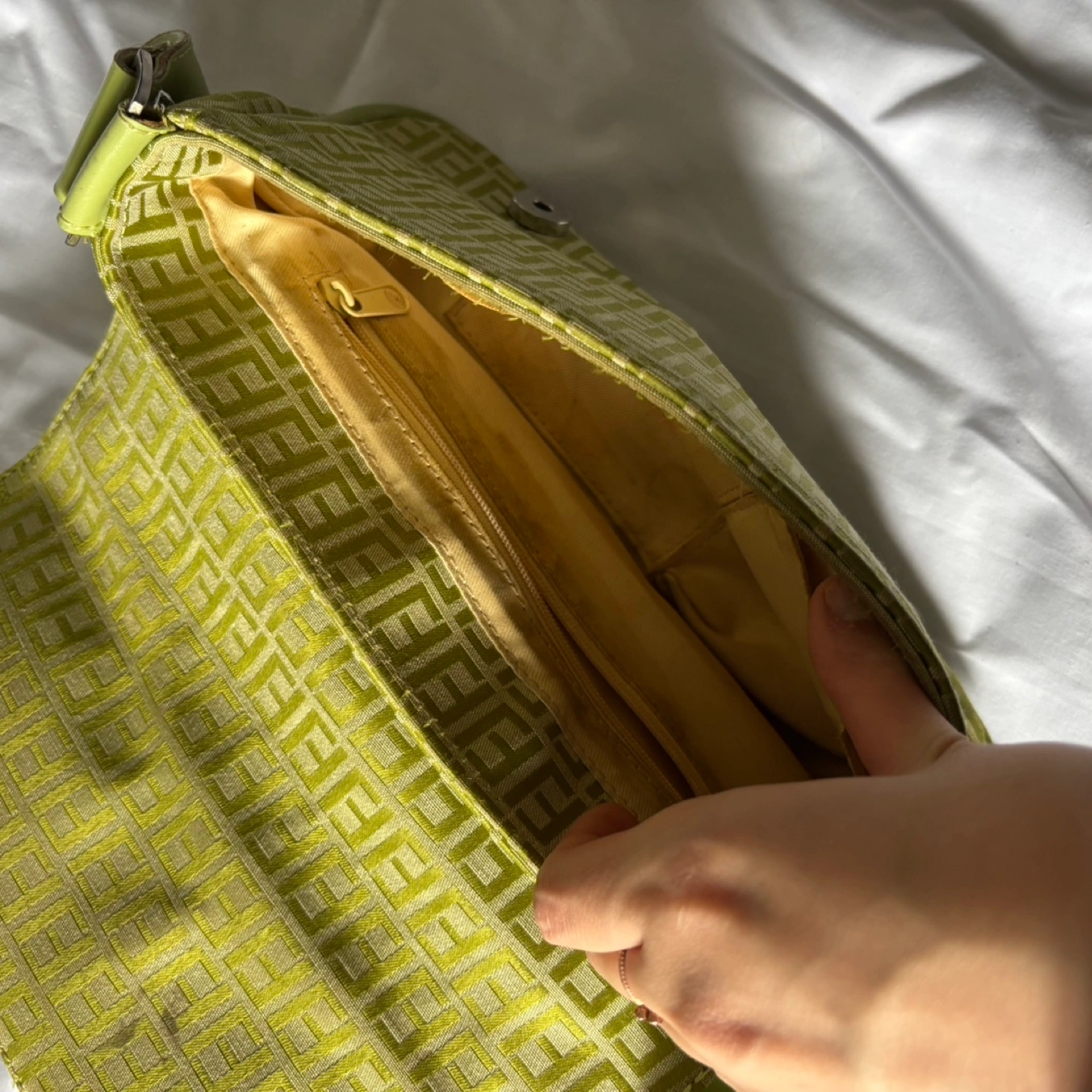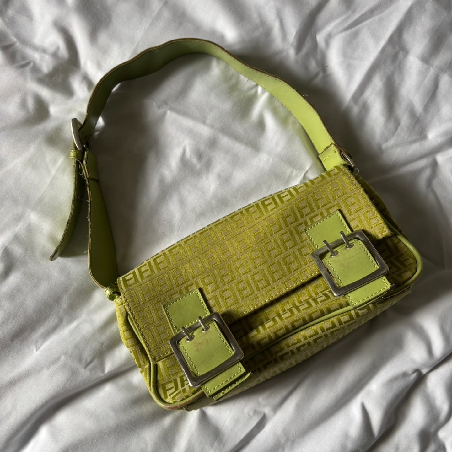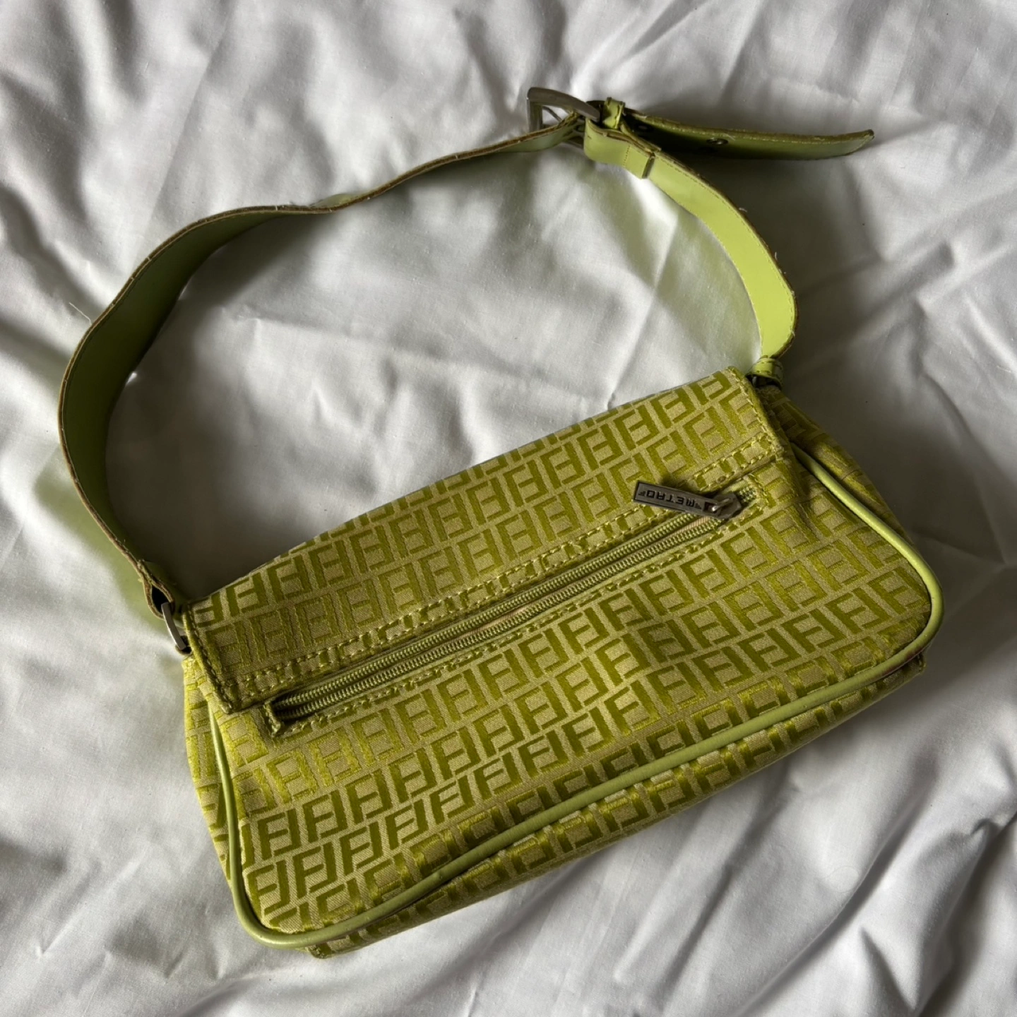 Gorgeous green Fendi shoulder bag. Features a light green patterned fabric. The bag has a zipper closure and a long strap. You could easily use this bag to bring with you all your essentials for a coffee date.