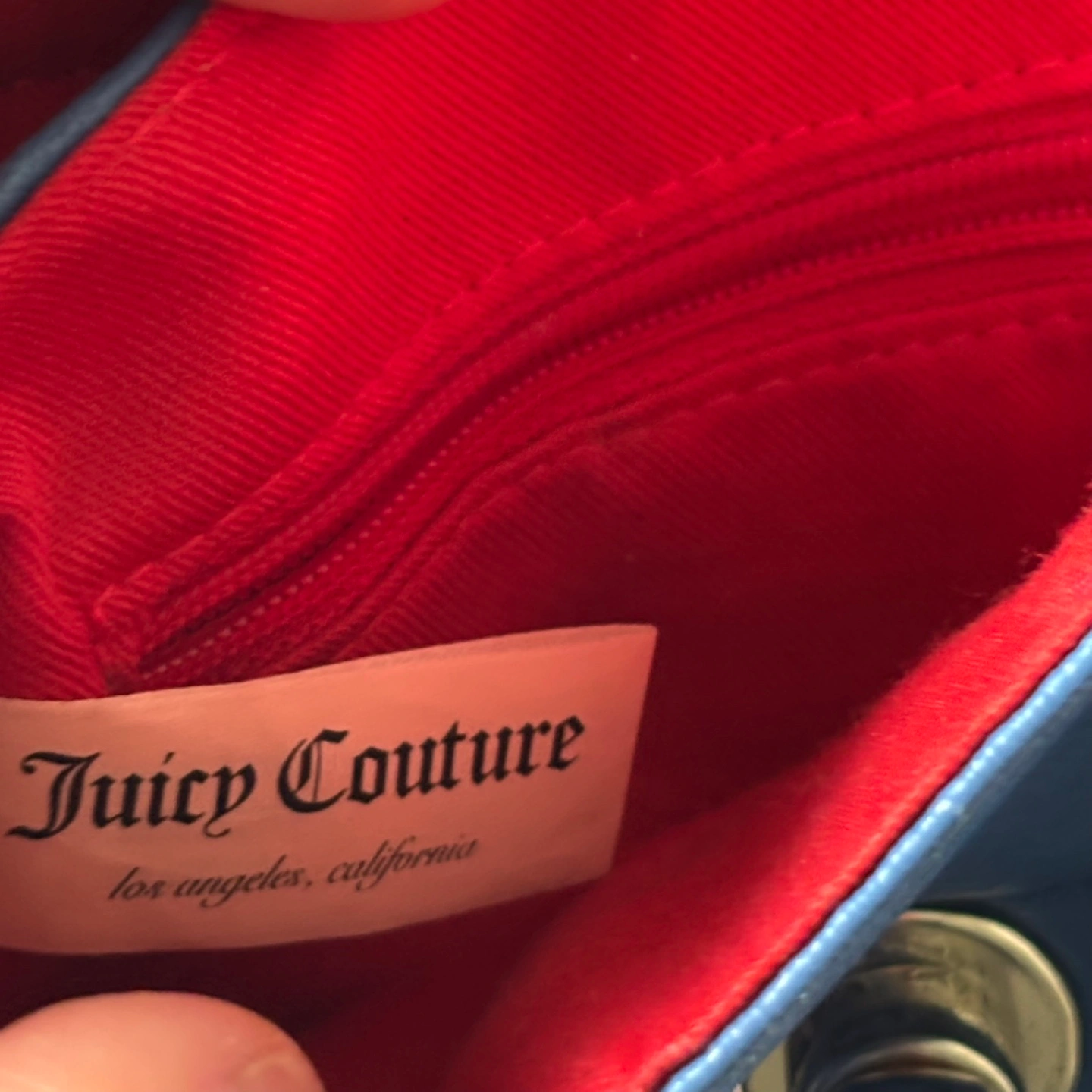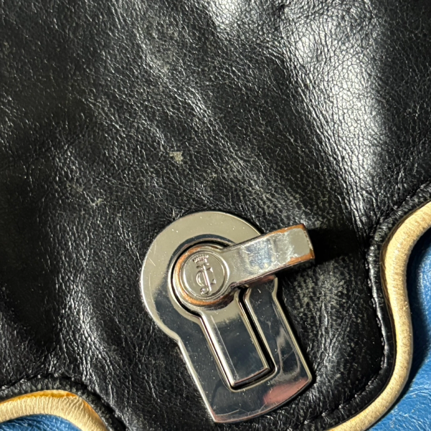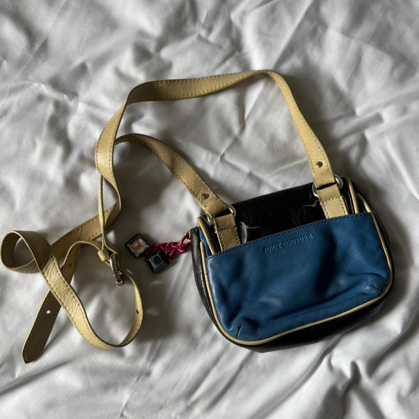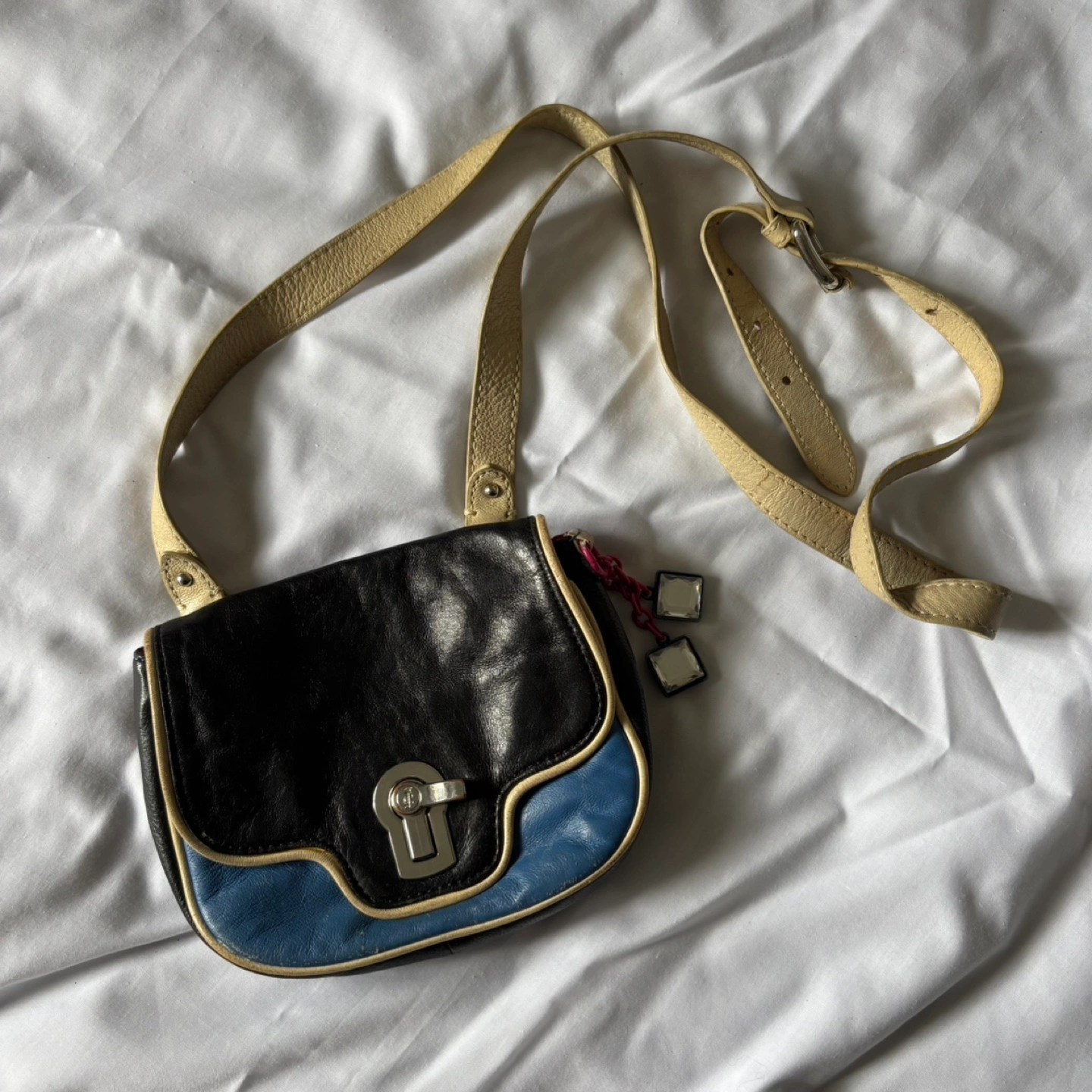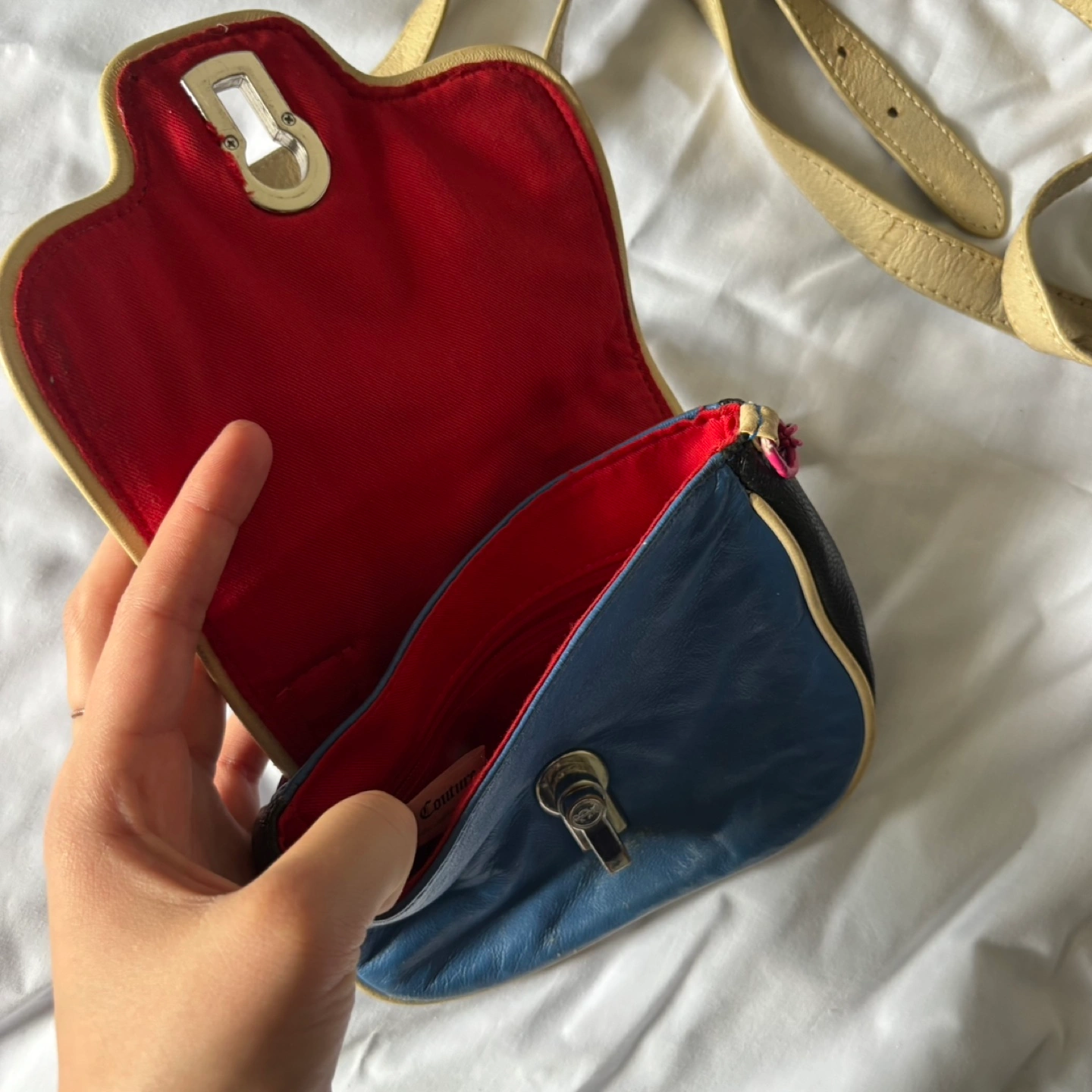 A compact crossbody bag featuring a black and blue design. The bag has a cream strap and cream trim. The bag's interior is red, with a zipper pocket. Perfect for keeping your essential items safe while out and about.