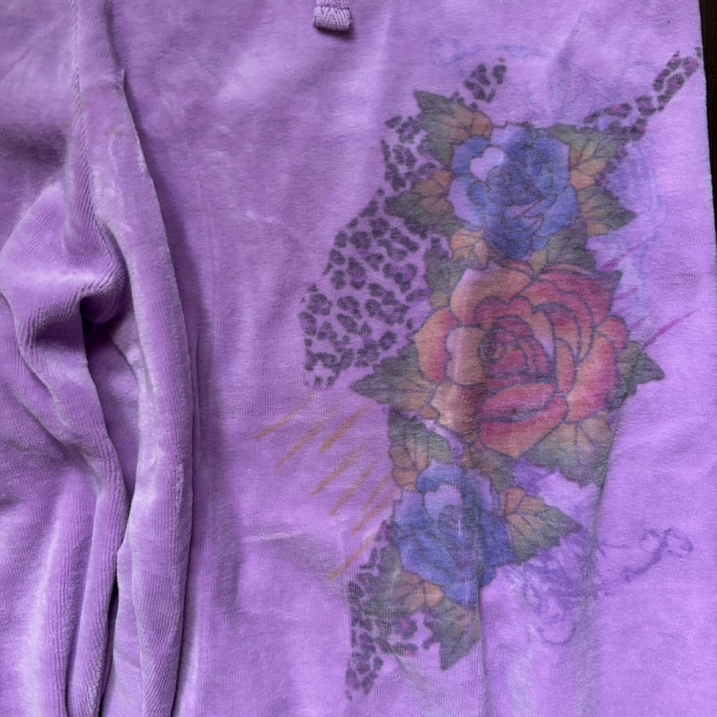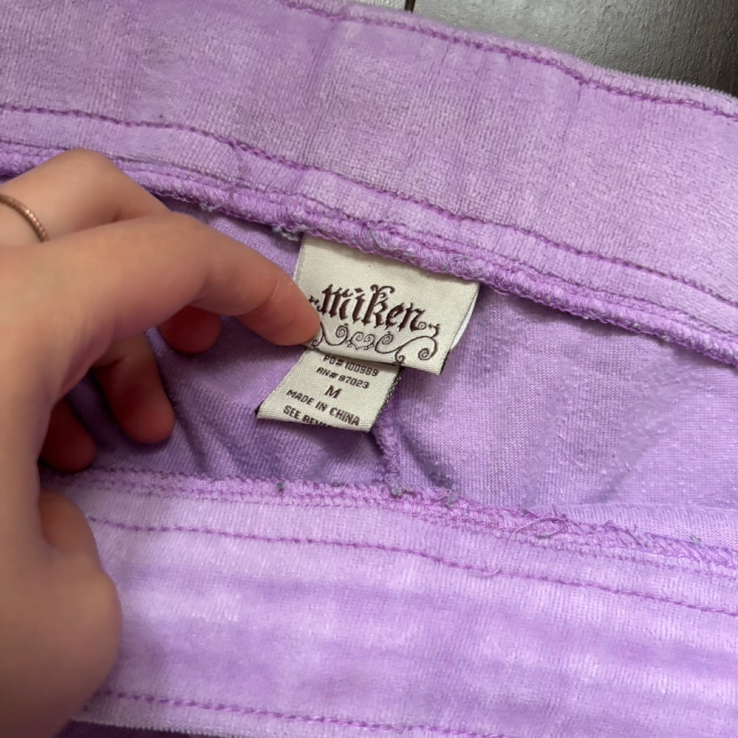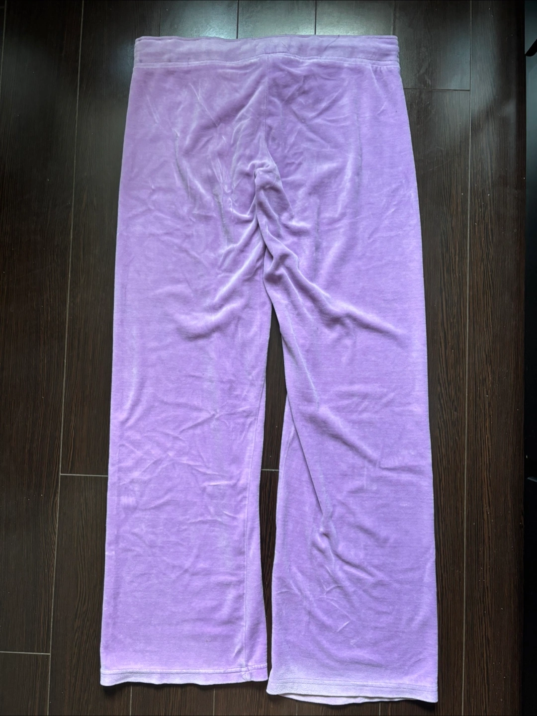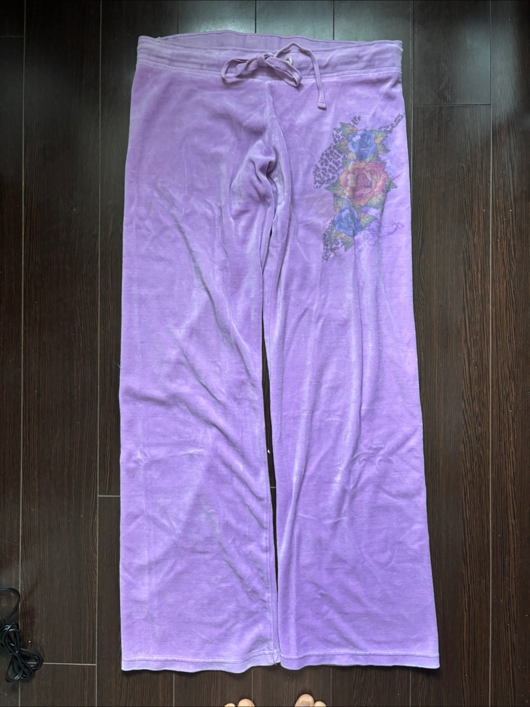 Soft lounge pants in a lavender hue. A drawstring waistband. Features a floral design on one leg. Perfect for relaxing after a long day.