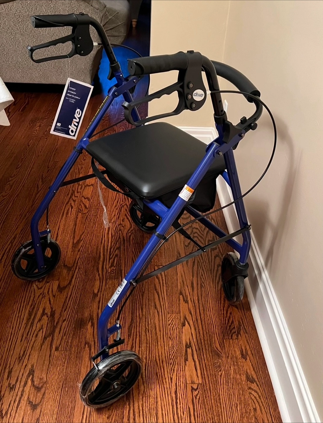 Brand New NEVER USED rolling walker in a blue colour. Featuring a seat for resting and storage pouch. Has hand brakes for safety. Drive brand name on the product. It is a great way to comfortably stroll around your home and neighbourhood.