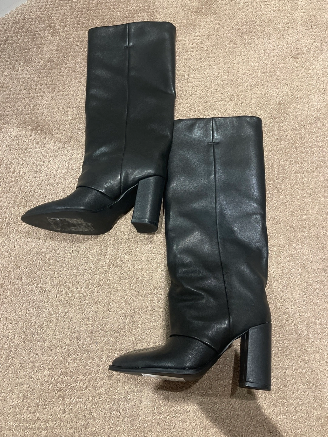 14Elegant black leather boots. Pointed toe with a block heel. Very chic and cool, brand new never worn. Real leather