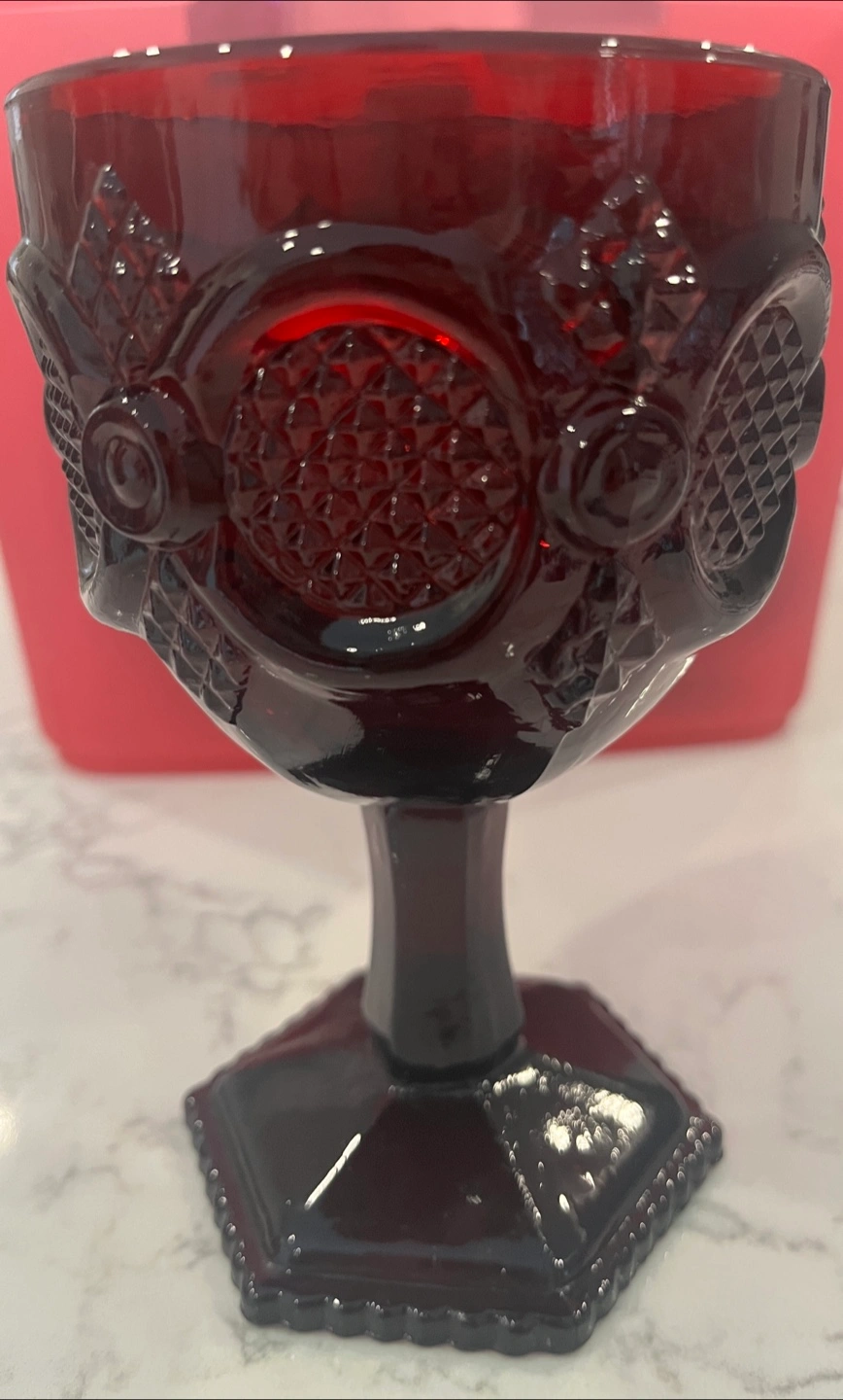 A beautiful goblet in a striking ruby red colour. Features an embossed design on the bowl, with a detailed stem and base. This goblet is perfect for enjoying a quiet glass of wine.