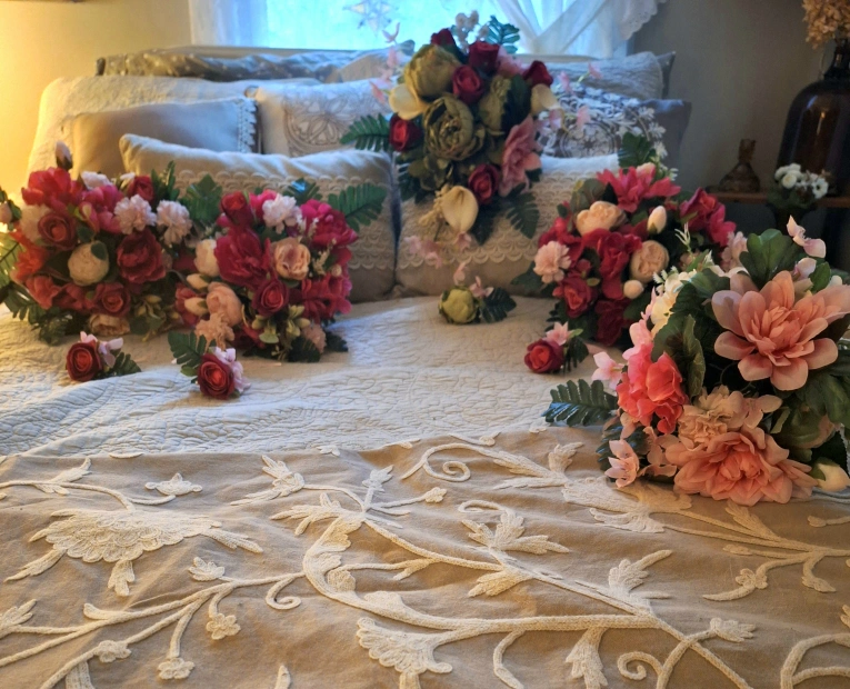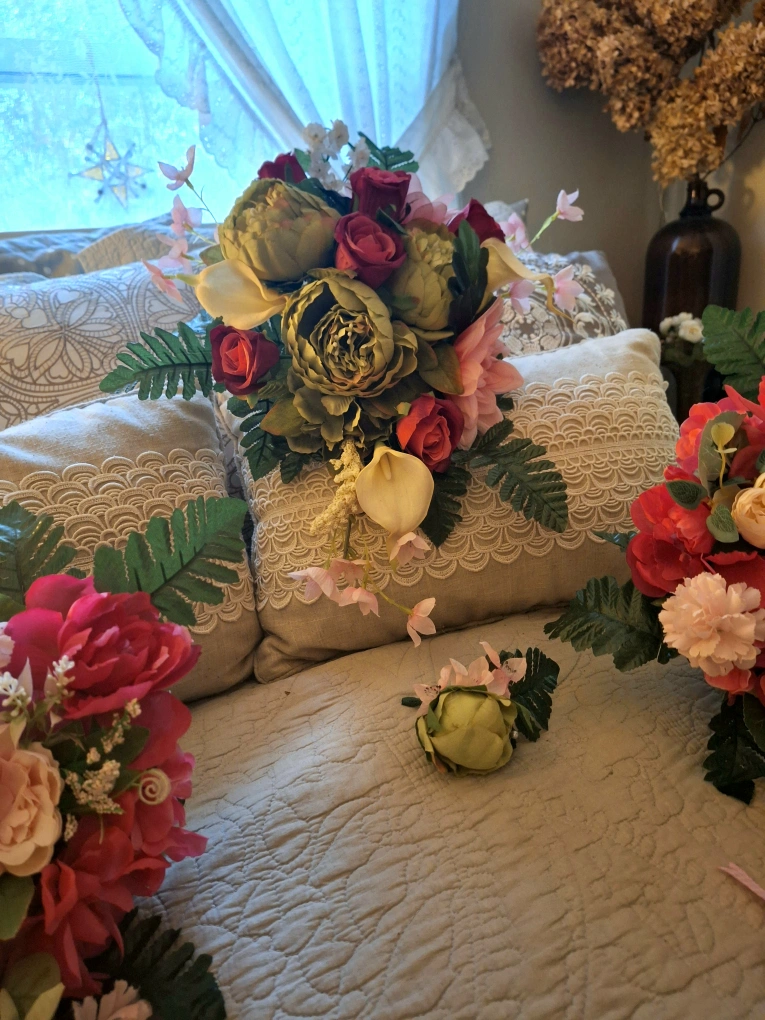 A collection of artificial flowers. Various sizes of bouquets. A few matching boutonnieres.