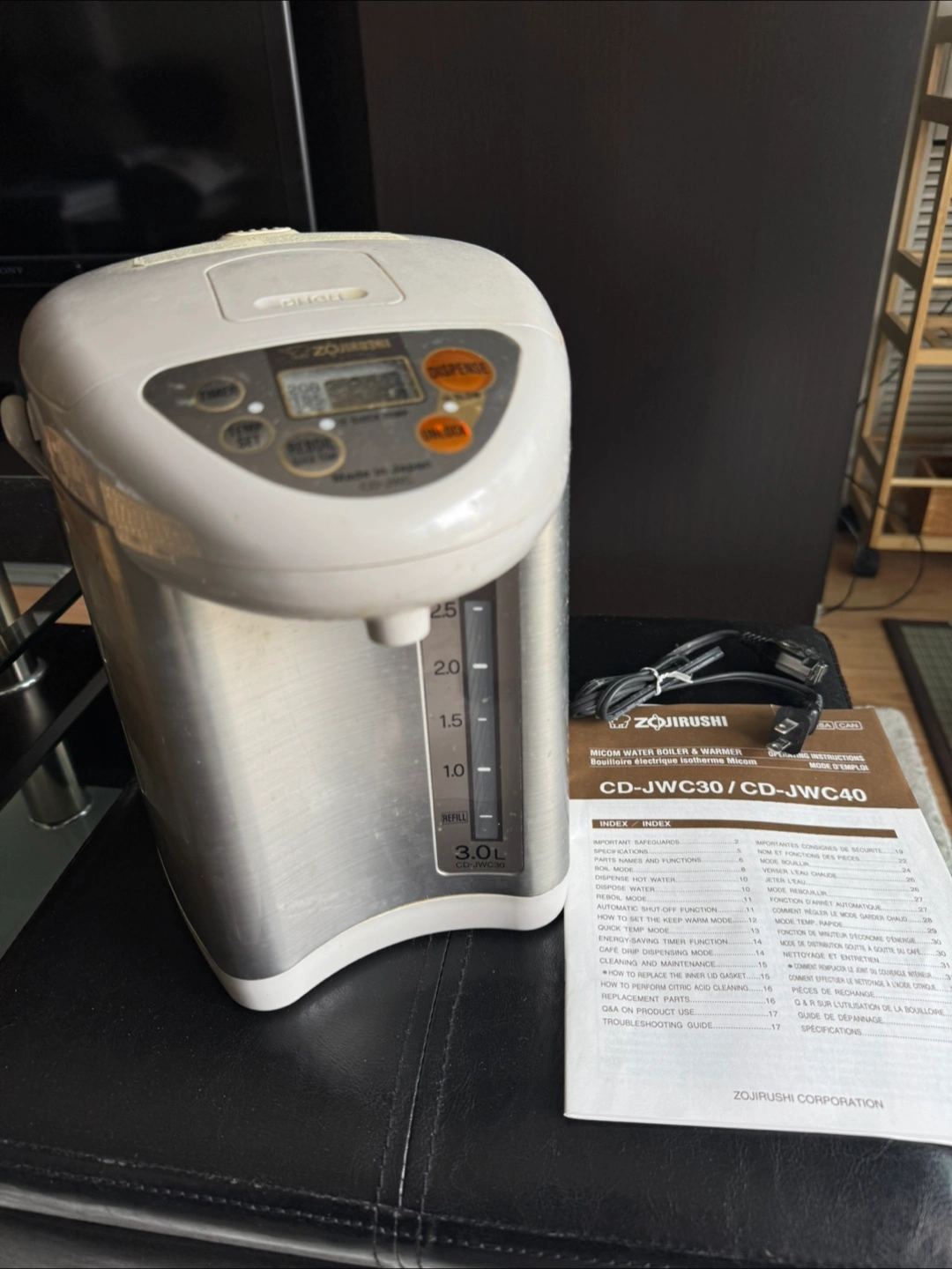 A water boiler and warmer. Features a digital display and various function buttons. Includes a handle for easy carrying. Works well but there is a very small leak (1 tsp of water collects underneath overnight). Can be managed with a piece of paper towel but I had to replace it for the long term. Still works well. Would be suitable for someone who wants to try out this type of appliance before buying one retail. Comes with user manual.