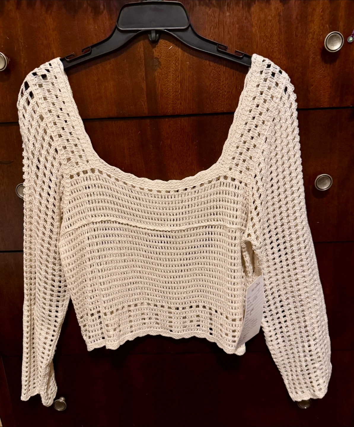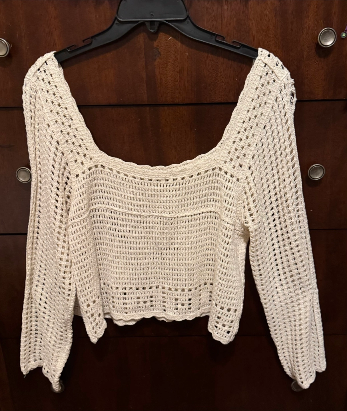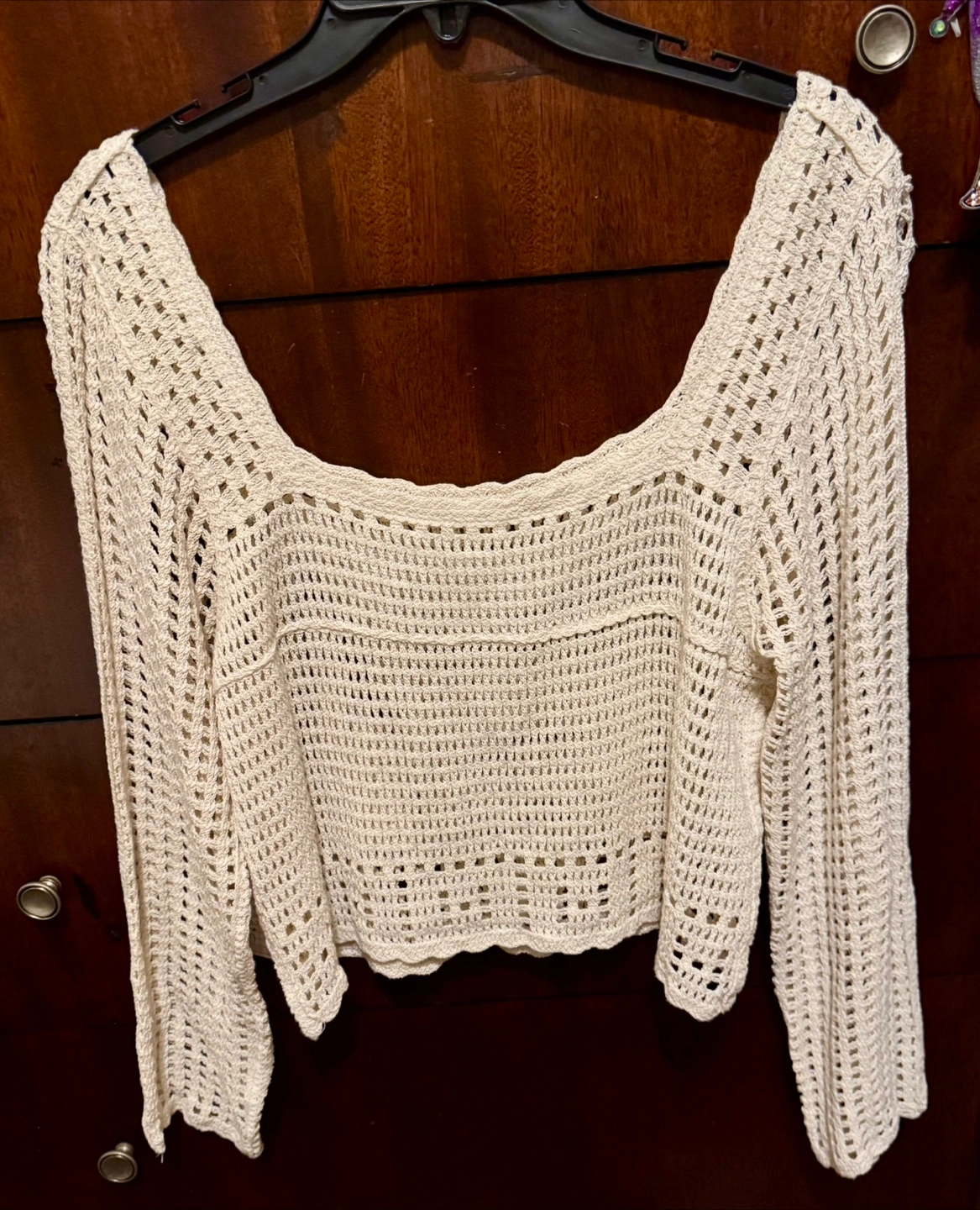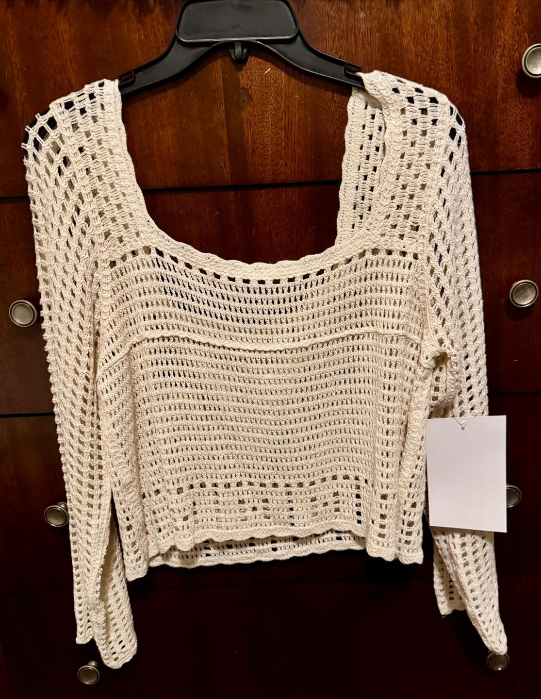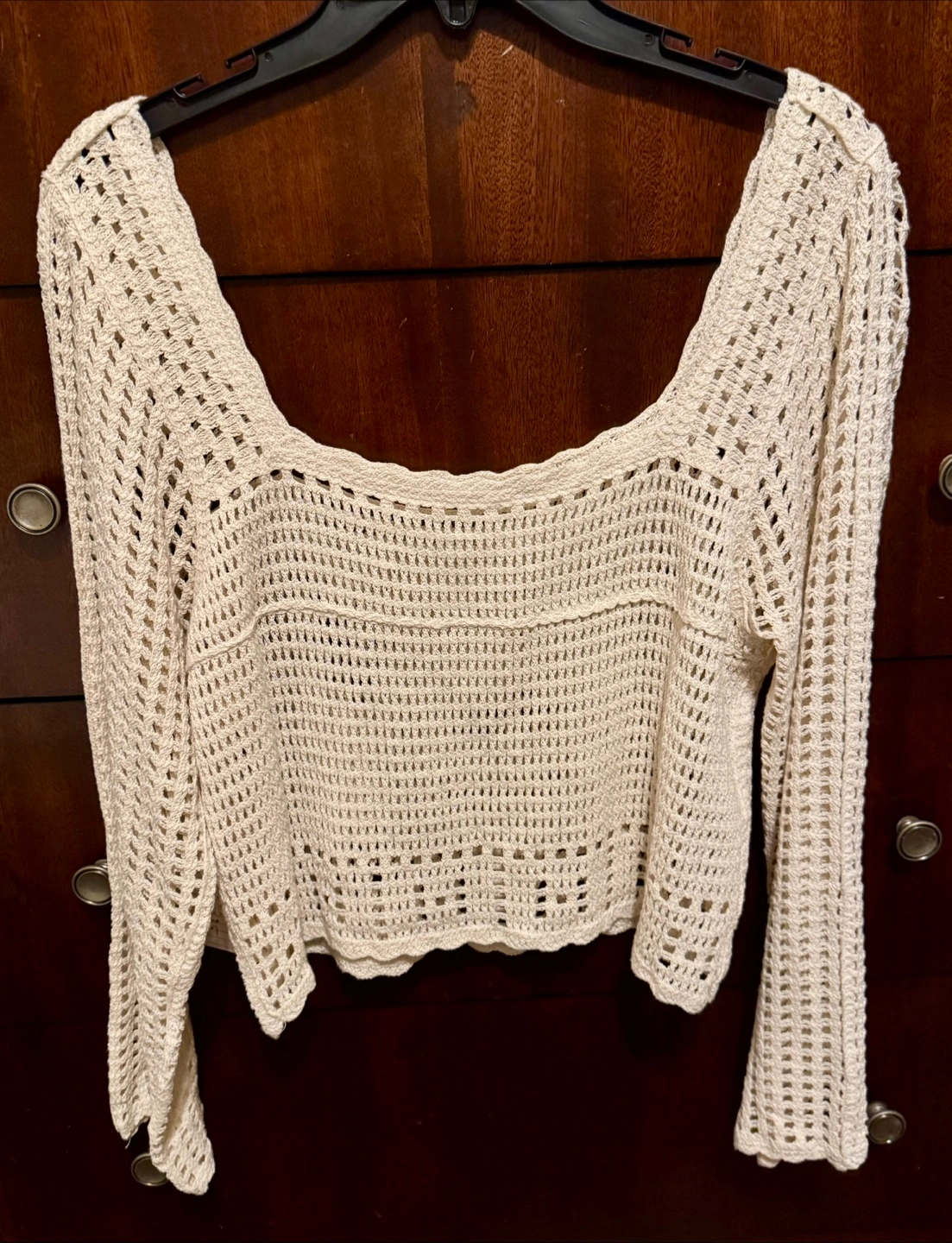 A cream colored crocheted top. The top has long sleeves and a square neckline. It is easy to wear with a pair of your favorite jeans and boots, for a stylish and comforting look.