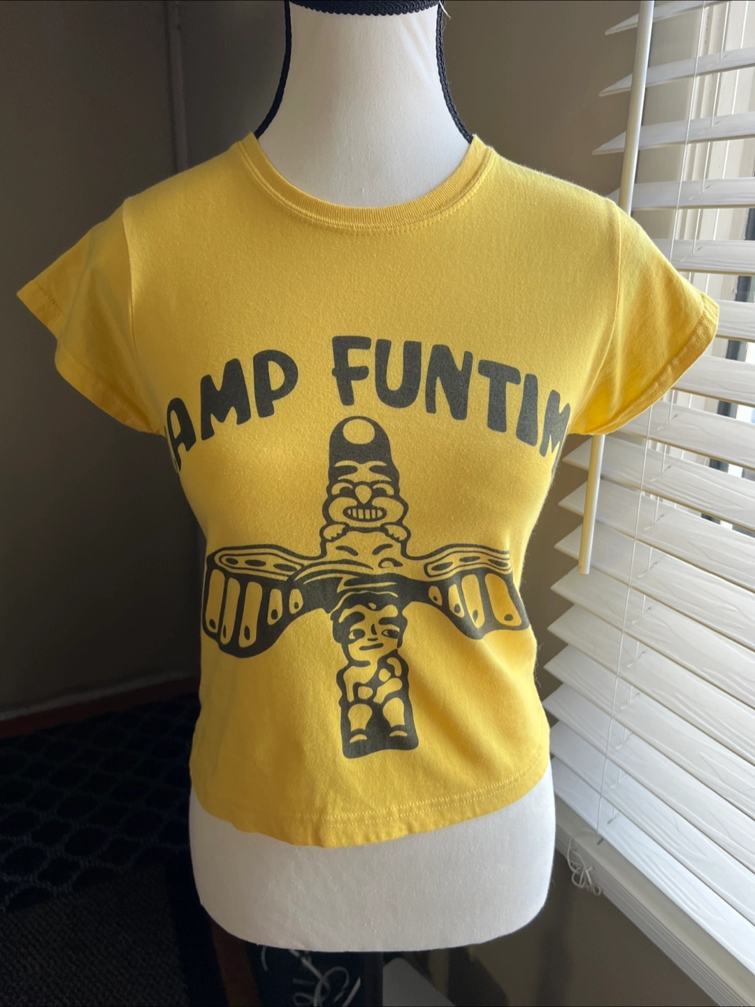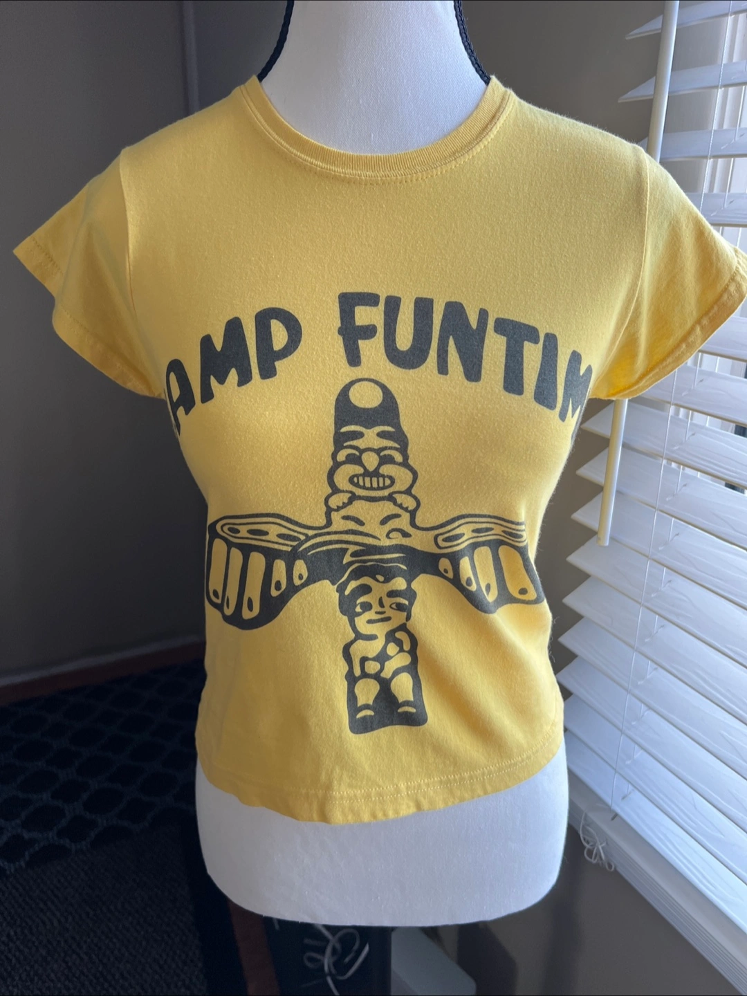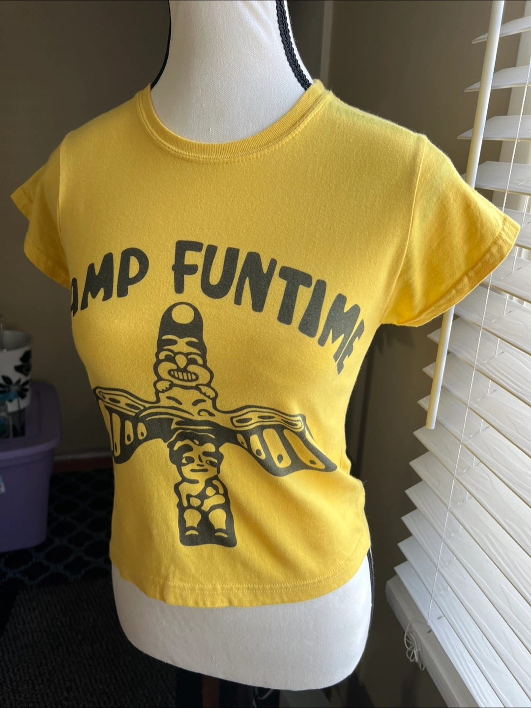 A short-sleeved cropped t-shirt. Size S. Gildan Brand. 100% cotton
