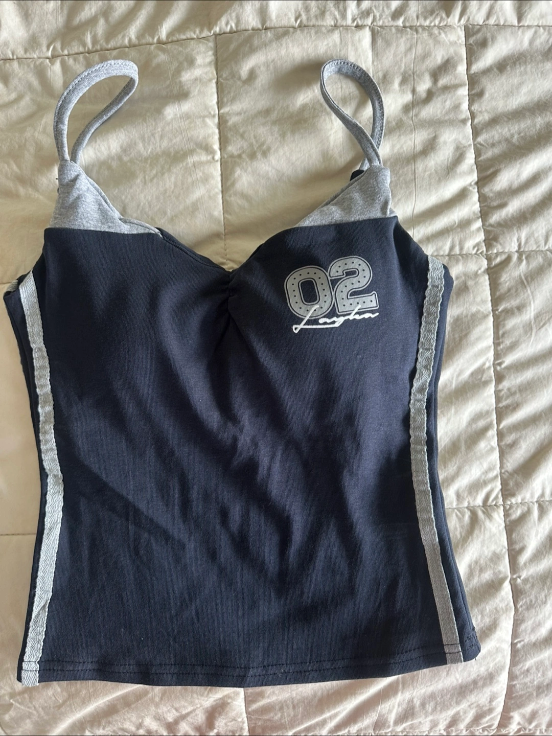 Navy blue tank top. Grey details on the top and straps. Side stripes on the sides. The top has an '02' graphic on the front. It's perfect for adding a touch of casual style to any outfit.