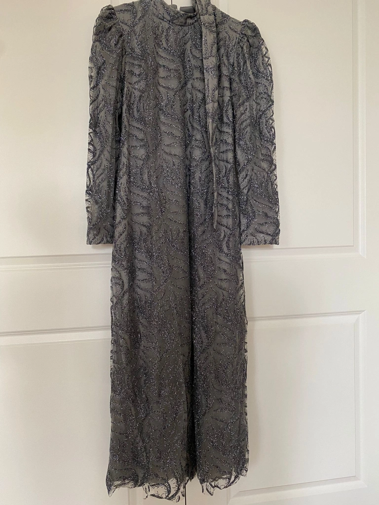 Beautiful formal dress. It has a high neck and long sleeves, with lovely detailing. The dress would be stunning at your next fancy event.