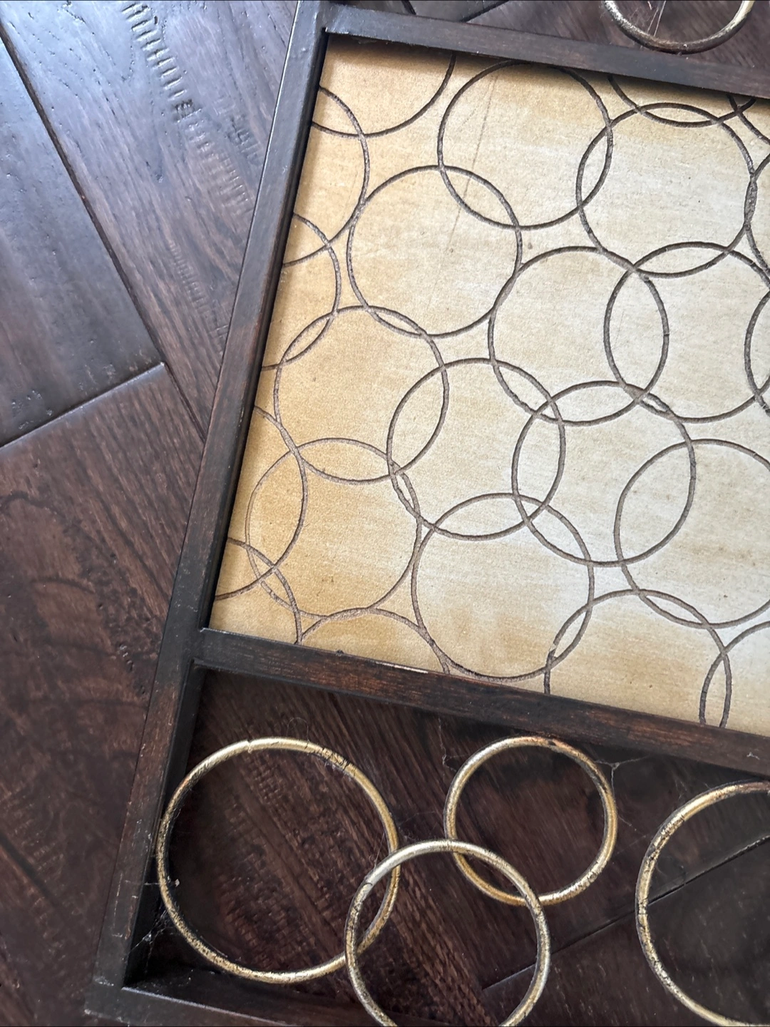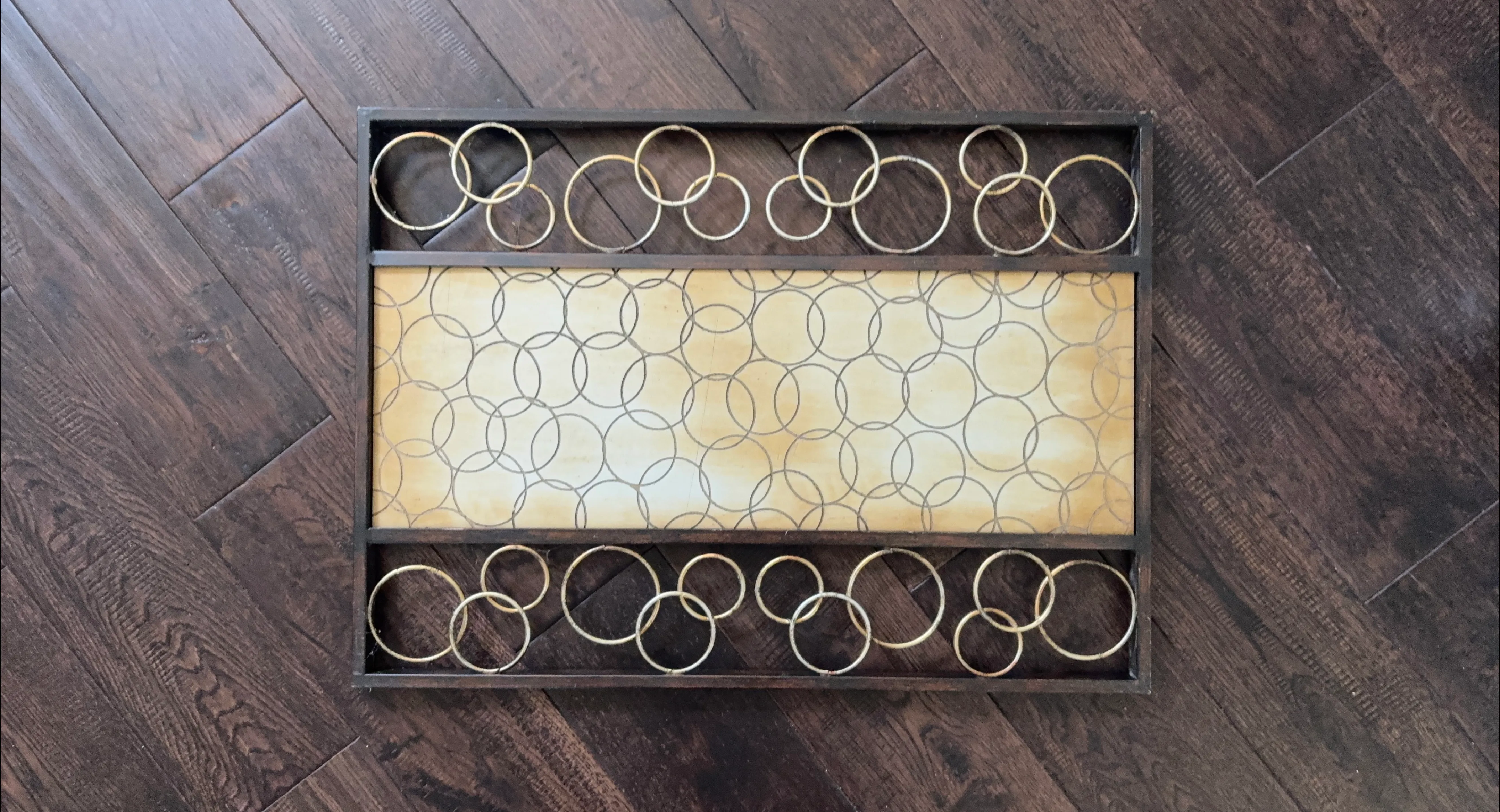 A rectangular wall hanging. Constructed with a dark wooden frame. Features a cream-coloured background with a circular pattern. Adorned with gold rings around the top and bottom. Place it in a tranquil spot for a peaceful vibe.