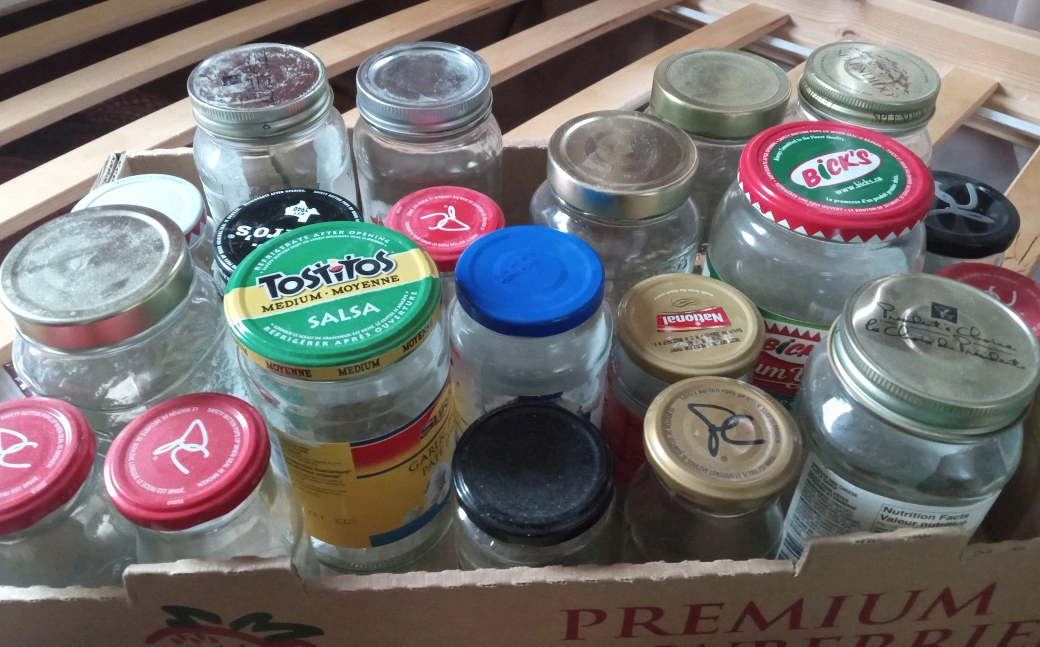 Glass jars of various sizes with lids (previously held salsa, spaghetti sauce, jam, pickles...) Clean. Perfect for storing dry goods or craft supplies. Free for pick up. More available. Let me know if you're looking for a certain type.